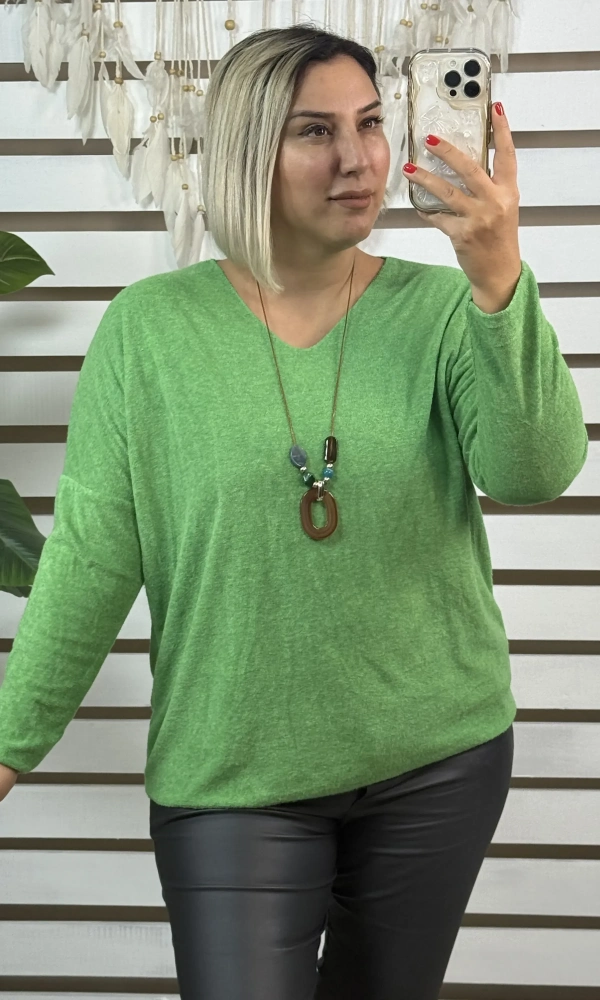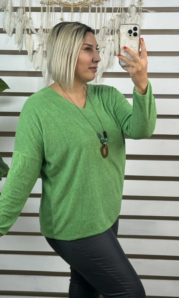 İtalyan Tasarım V Yaka Kolyeli Dokulu Bluz Çimen Yeşili