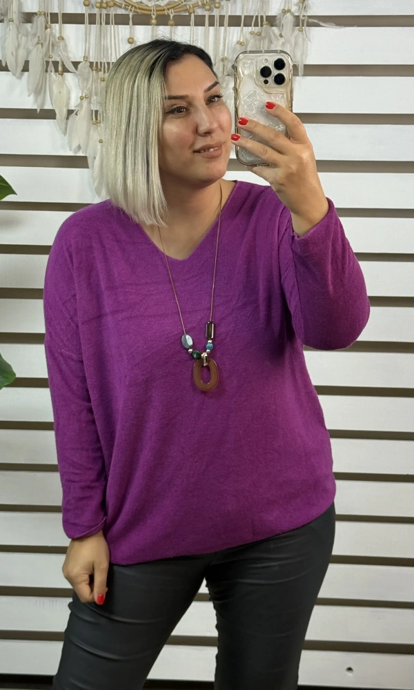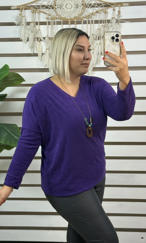 İtalyan Tasarım V Yaka Kolyeli Dokulu Bluz Mor