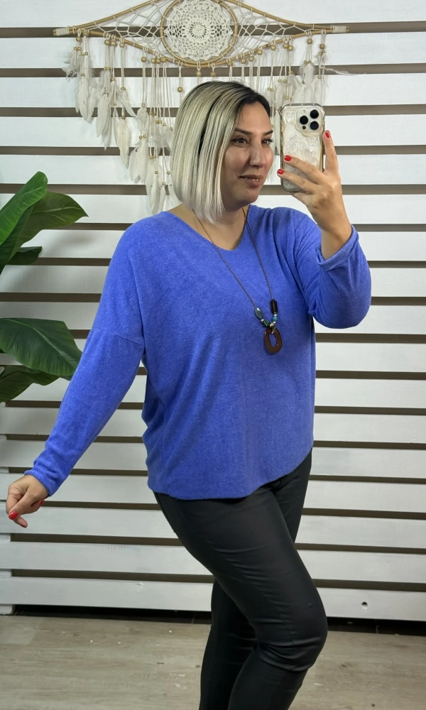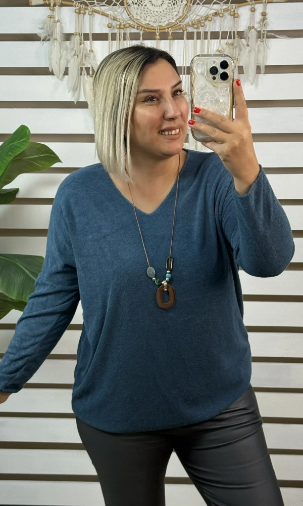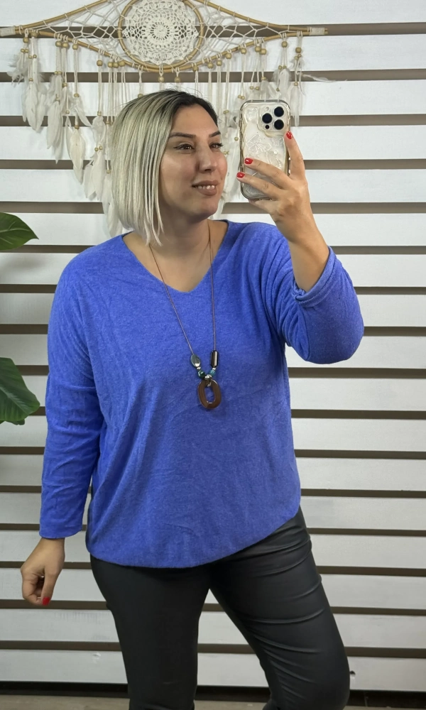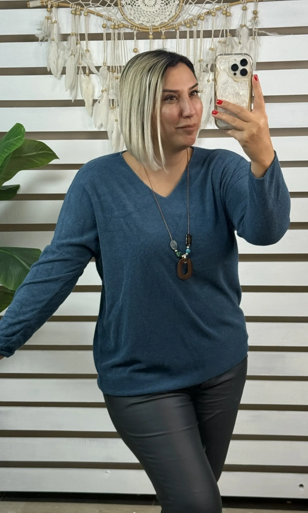 İtalyan Tasarım V Yaka Kolyeli Dokulu Bluz Mavi