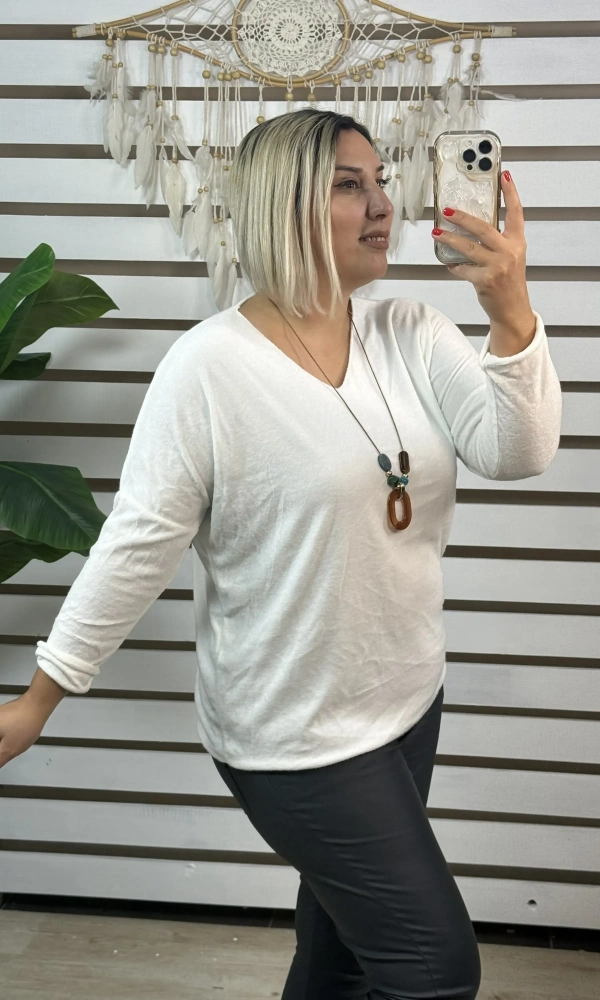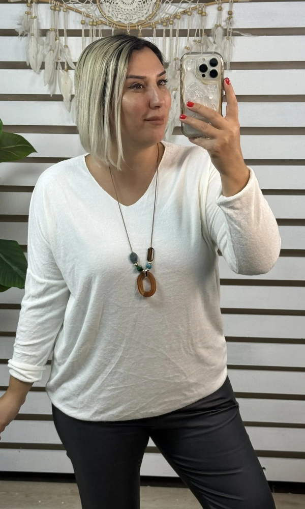 İtalyan Tasarım V Yaka Kolyeli Dokulu Bluz Beyaz