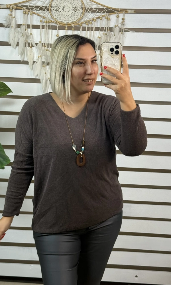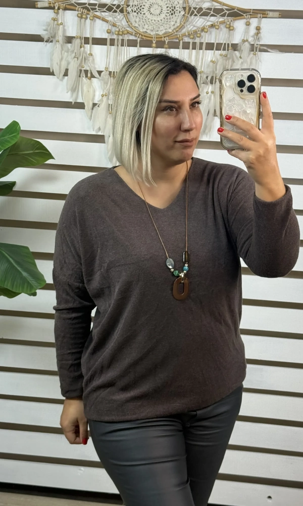 İtalyan Tasarım V Yaka Kolyeli Dokulu Bluz Kahverengi