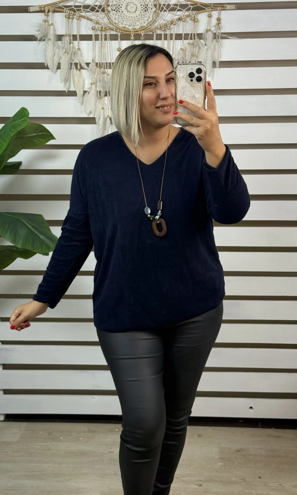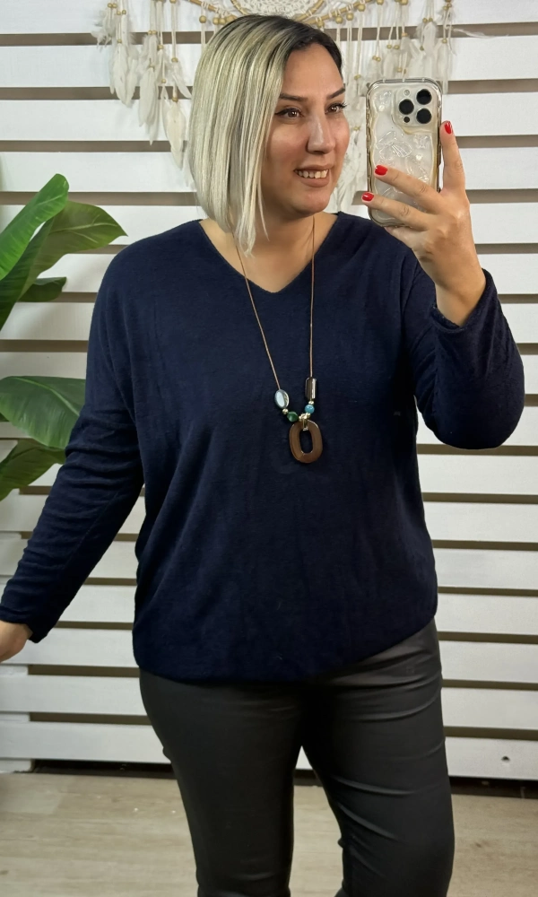 İtalyan Tasarım V Yaka Kolyeli Dokulu Bluz Lacivert