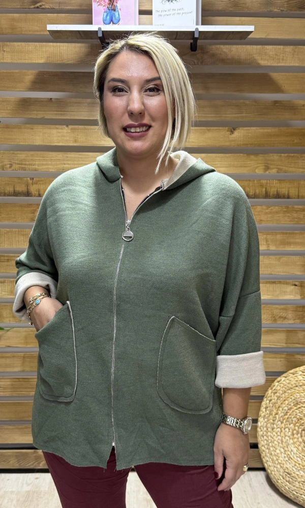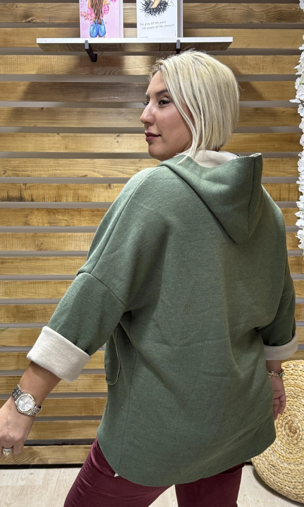 İtalyan Tasarım Kapüşonlu Düz Desen Kap Haki