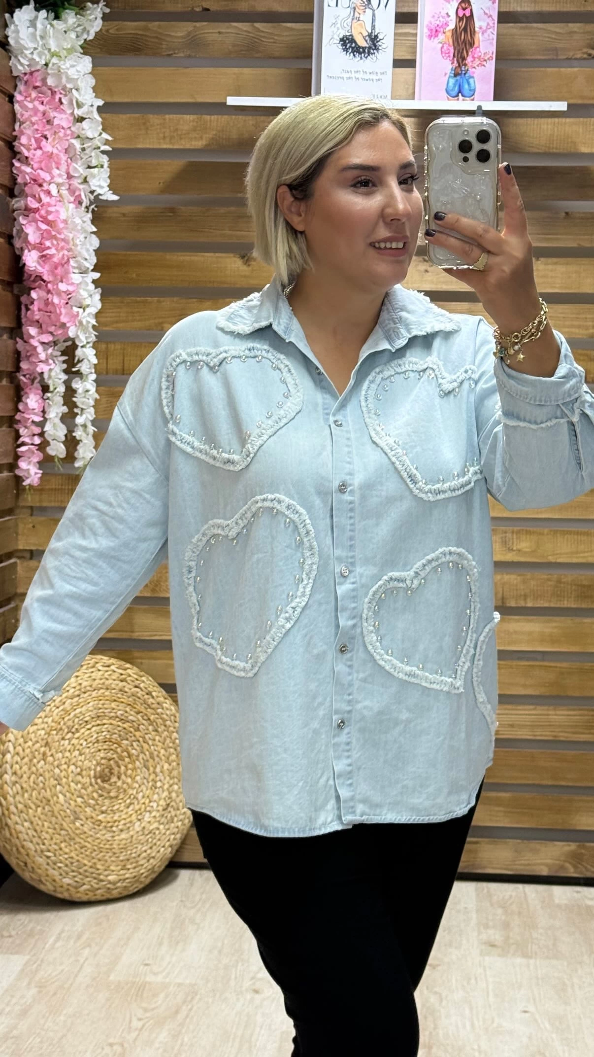 Romantik detaylarla modern tarzı birleştiren bu özel kot gömlek, üzerindeki zarif kalp desenleri ile gardırobunuza şık bir dokunuş katar. Yumuşak ve kaliteli kot kumaşı sayesinde gün boyu rahatlık sunarken, oversize kalıbı sayesinde konforlu ve salaş bir görünüm elde edersiniz.
