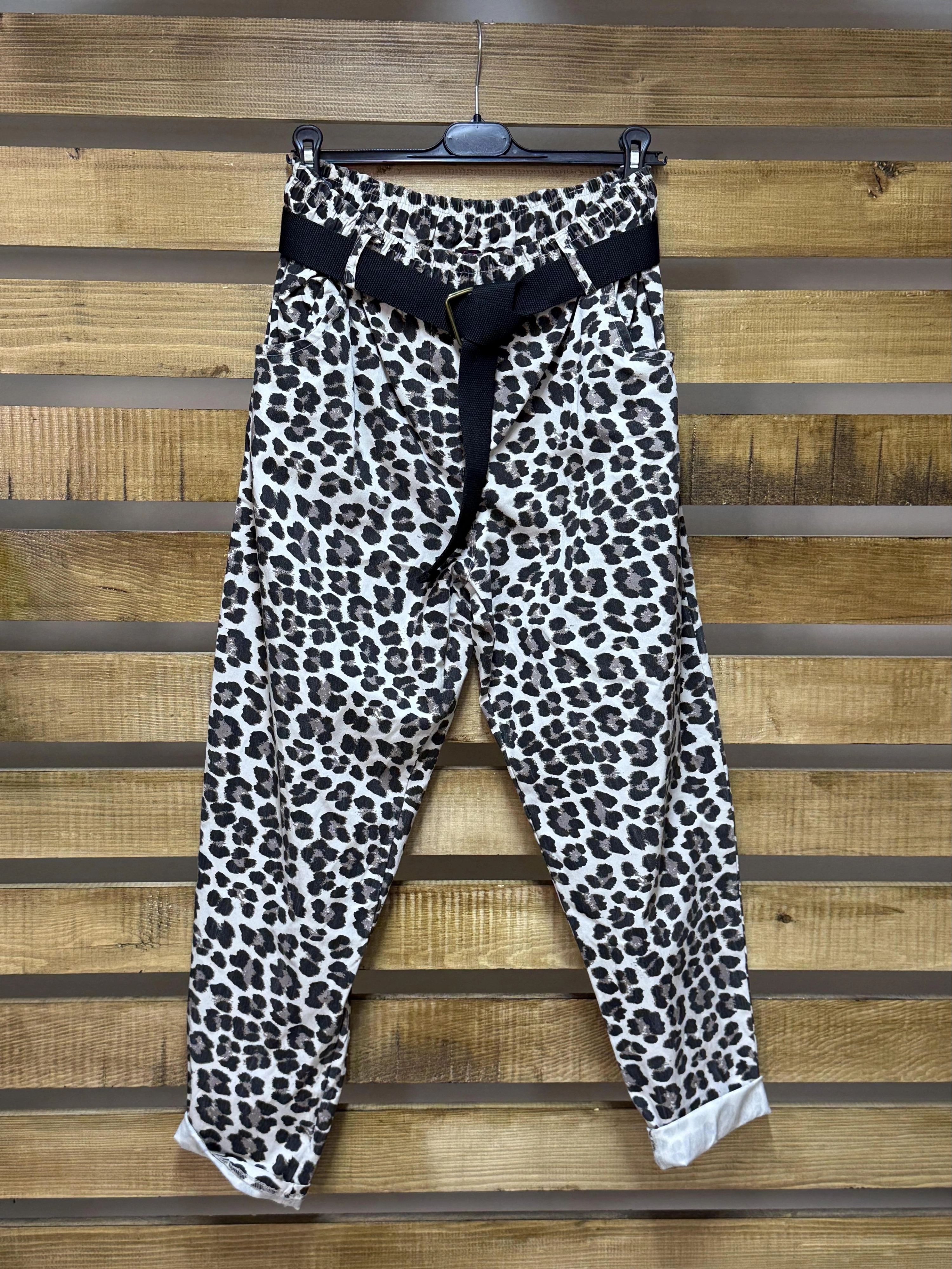Şıklık ve rahatlığı bir arada sunan bu özel tasarım pantolon, ithal kumaşı ve zarif leopar deseni ile dikkat çeker. Yüksek bel kesimi ve belinde yer alan kemer detayıyla modern bir görünüm kazandırır.