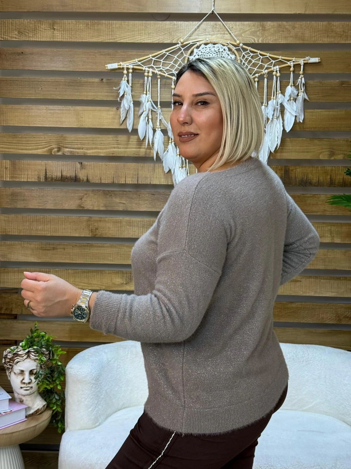 ? Zarif ve modern detaylarıyla öne çıkan bu özel kazak, yumuşacık angora dokusu ve ışıltılı simli kumaşıyla dikkat çeker.
