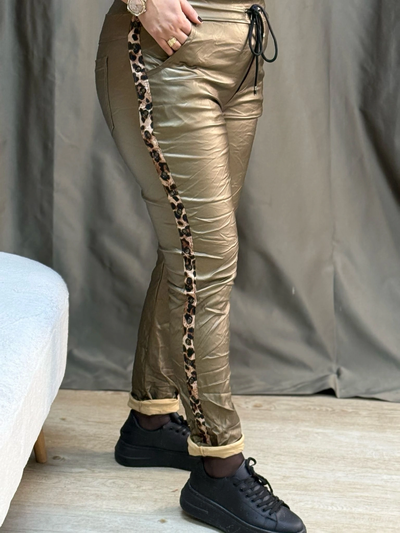 İtalyan Tasarım Deri Leopar Detaylı Likralı Pantolon Gold