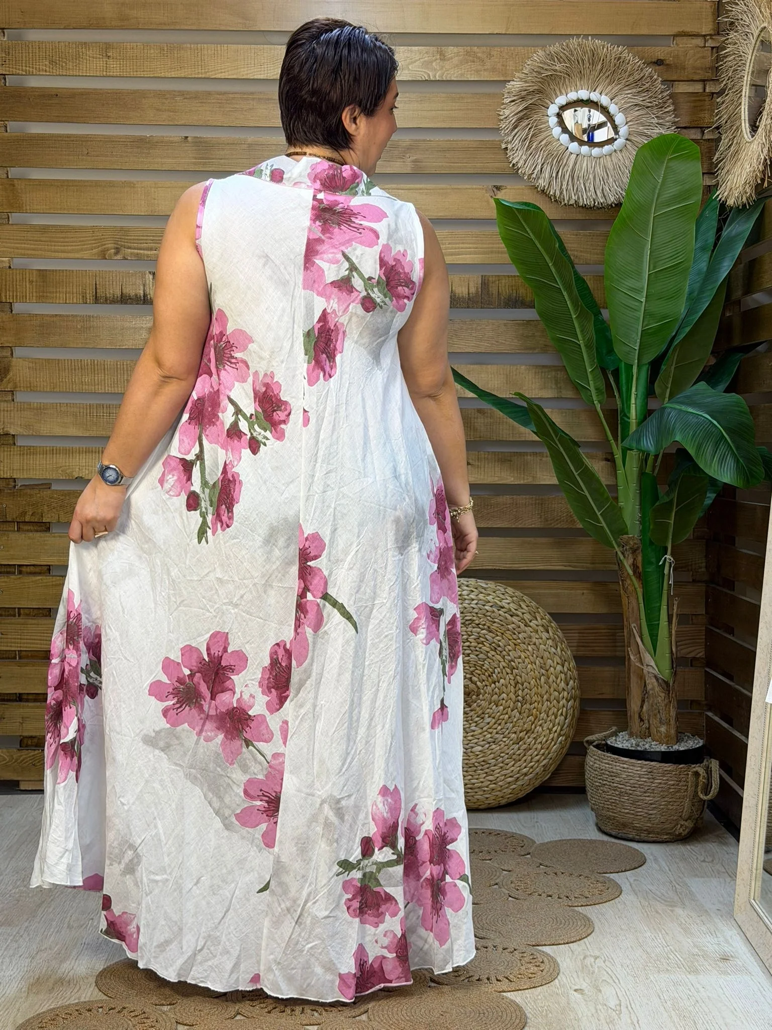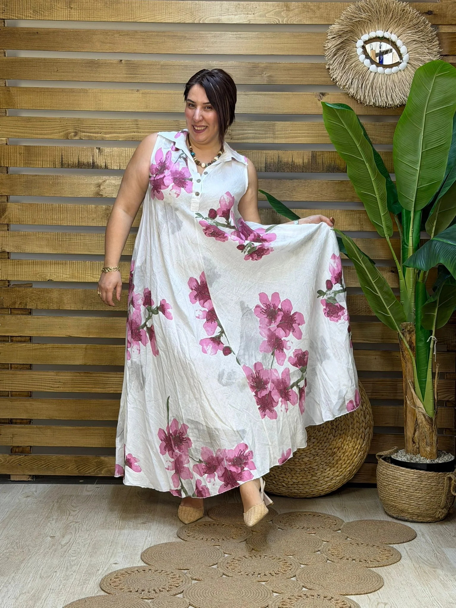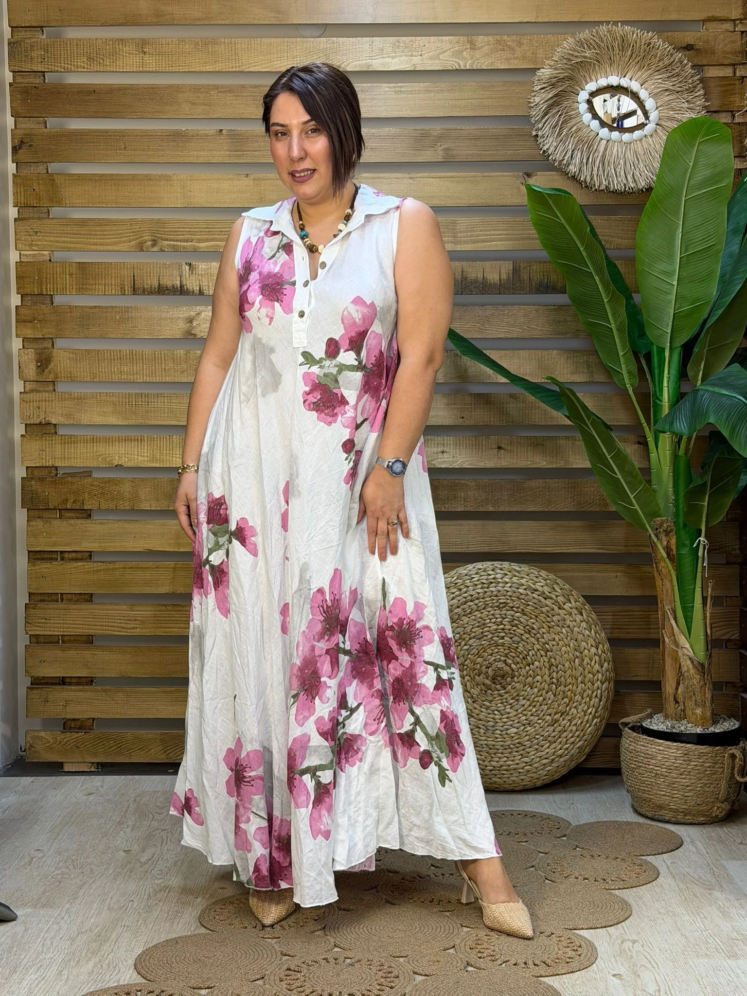 • İthal İtalyan tasarımı, dijital çiçek baskılı yüksek kalite ham keten elbise. 48 bedene kadar uyumlu standart dökümlü kalıbıyla nefes alan yazlık şıklık.