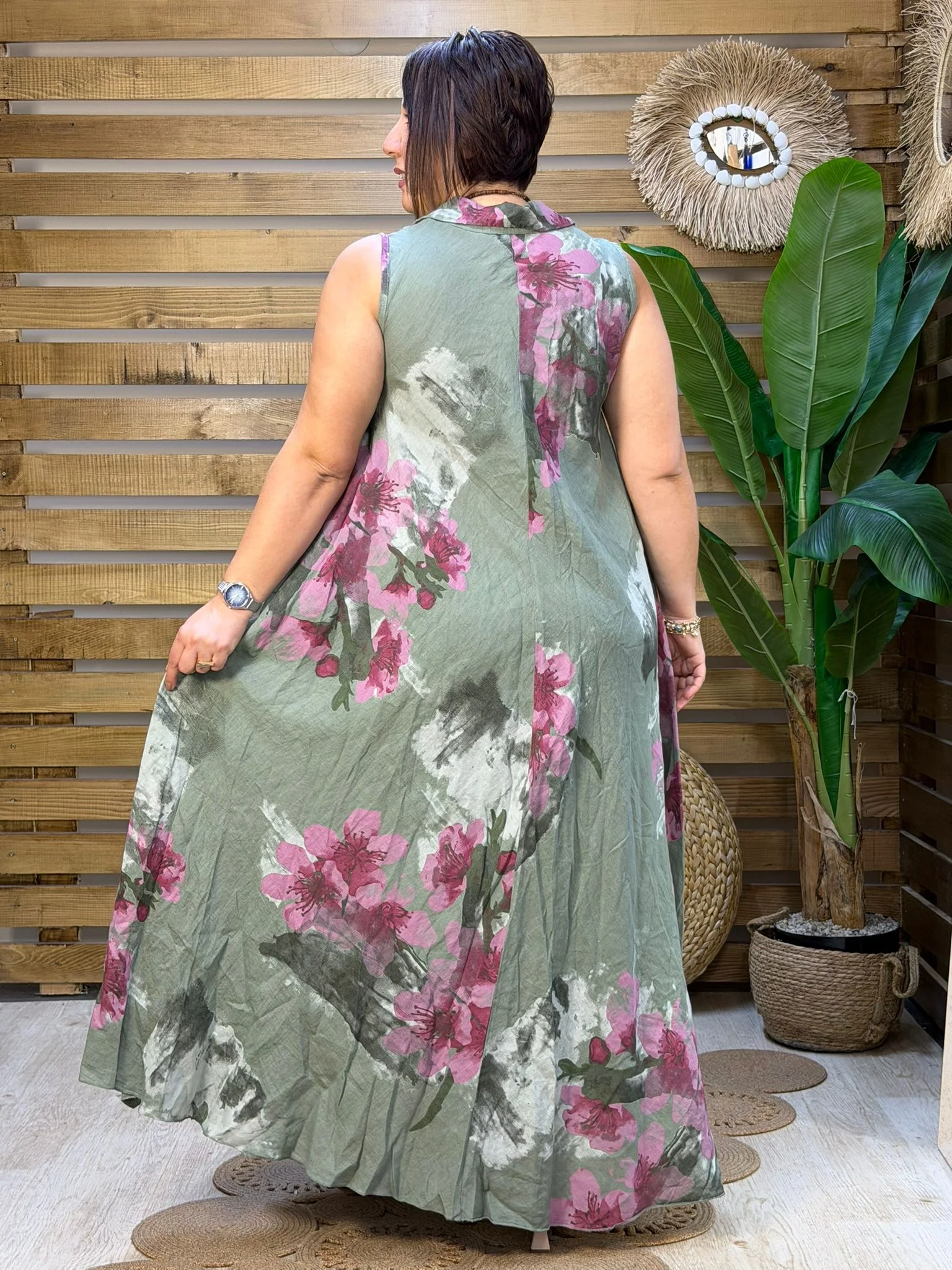• İthal İtalyan tasarımı, dijital çiçek baskılı yüksek kalite ham keten elbise. 48 bedene kadar uyumlu standart dökümlü kalıbıyla nefes alan yazlık şıklık.