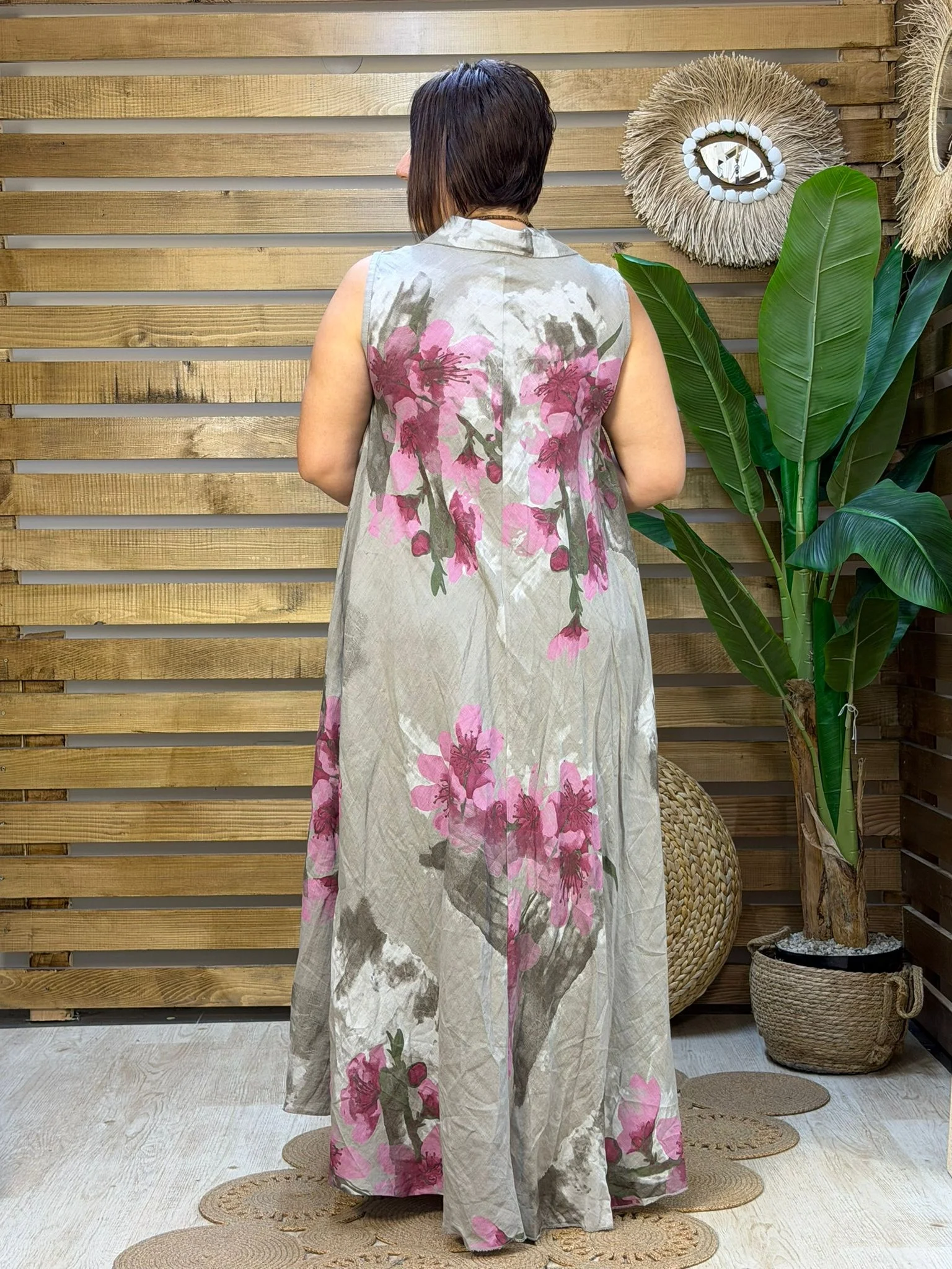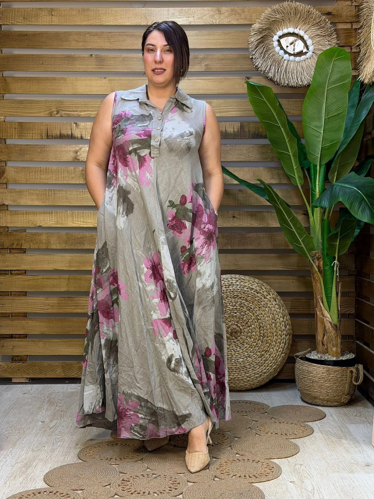 • İthal İtalyan tasarımı, dijital çiçek baskılı yüksek kalite ham keten elbise. 48 bedene kadar uyumlu standart dökümlü kalıbıyla nefes alan yazlık şıklık.