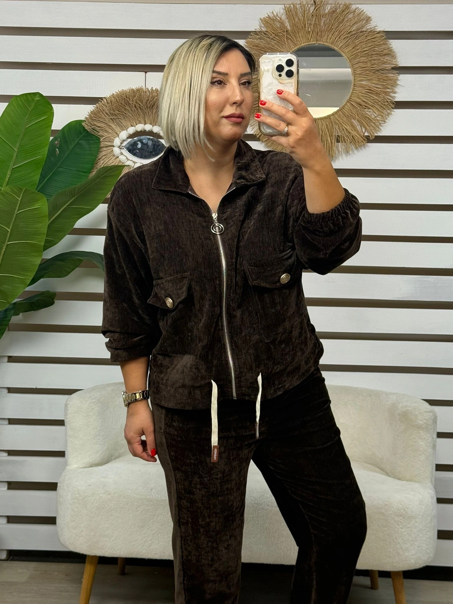 Zarif detayları ve modern çizgisiyle öne çıkan bu kadife takım, sofistike şıklığı konforla birleştirir. Düğme detayları ve çift cepli tasarımıyla hem fonksiyonel hem de estetik bir görünüm sunar.