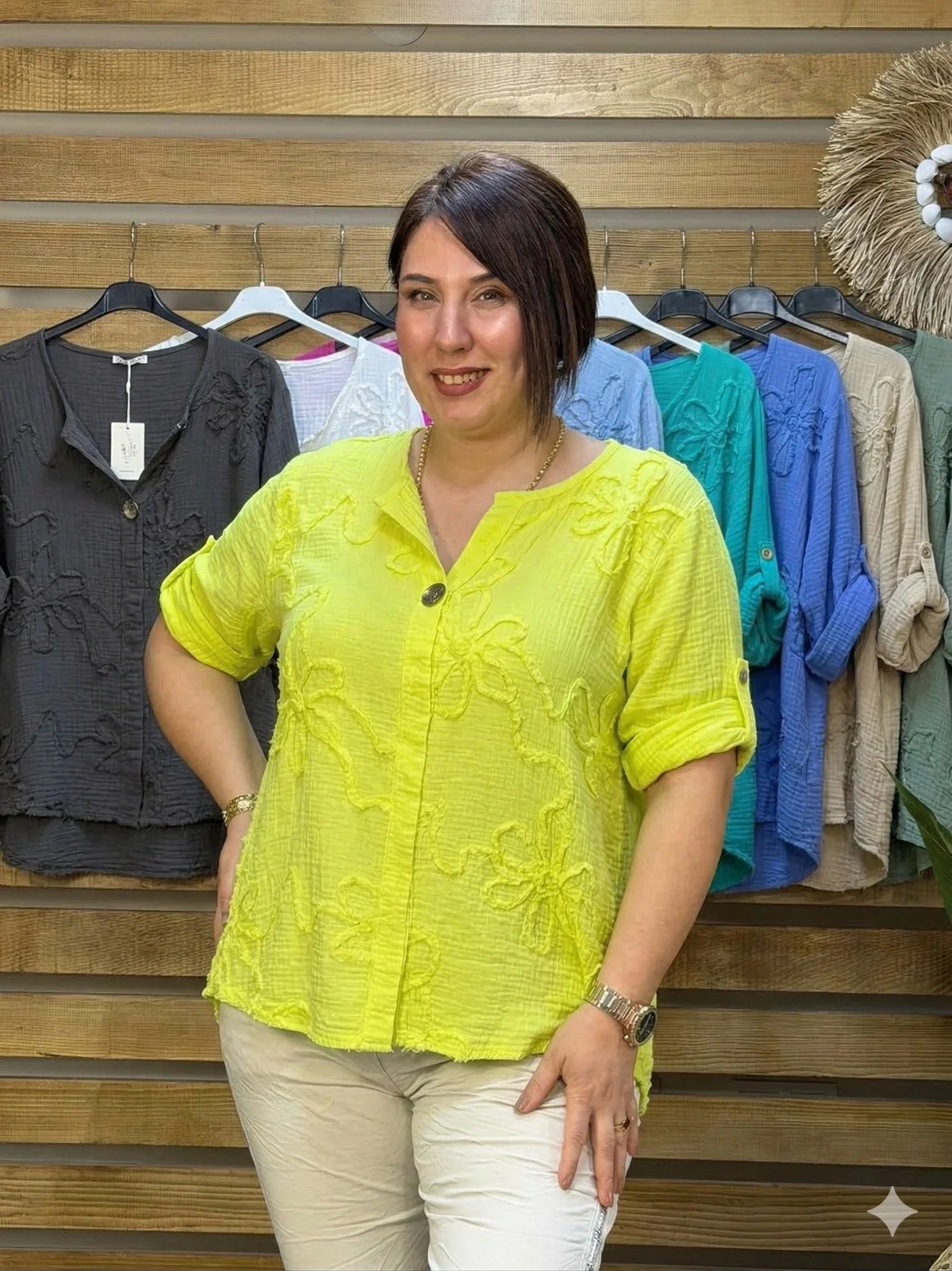 • İthal İtalyan tasarımı, gold düğmeli ve nakışlı yüksek kalite müslin bluz. 48 bedene kadar uyumlu standart kalıbı ve hafif yapısıyla yazın vazgeçilmezi.
