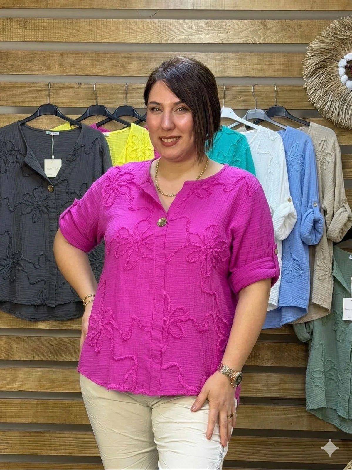 Zarif nakış işlemeleri ve lüks bir dokunuş katan gold düğme detayları, bu gömlek bluzu sıradanlıktan çıkararak Paprica Butik standartlarına taşıyor. Gündüzden geceye, şortlarla veya keten pantolonlarla zahmetsizce kombinleyebileceğiniz bu parça, yaz gardırobunuzun en değerli üyelerinden biri olacak.
