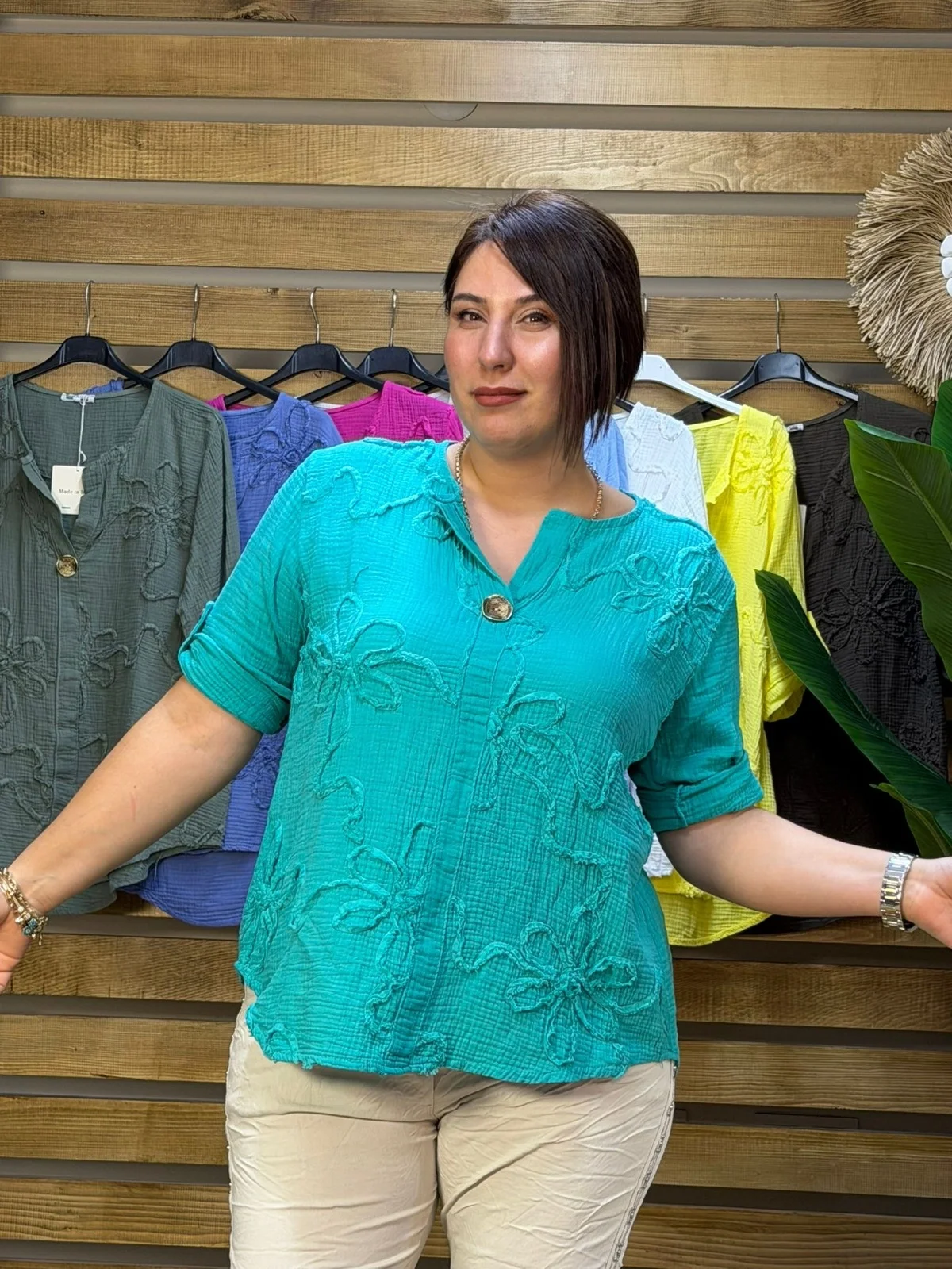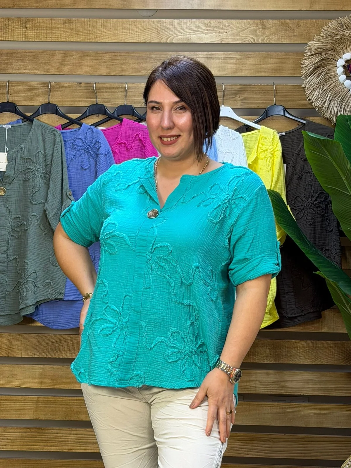 • İthal İtalyan tasarımı, gold düğmeli ve nakışlı yüksek kalite müslin bluz. 48 bedene kadar uyumlu standart kalıbı ve hafif yapısıyla yazın vazgeçilmezi.