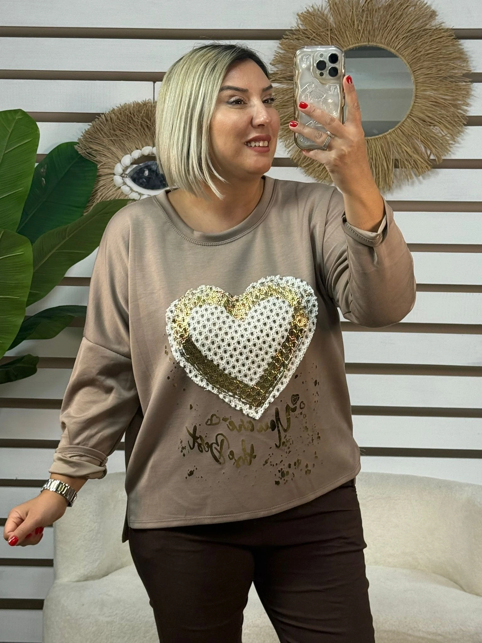 Romantik detaylarıyla öne çıkan bu özel tasarım bluz, kalp desenini yaldızlı dokular ve file detaylarıyla buluşturarak zarif bir ışıltı sunar. İtalyan tasarım çizgilerinden ilham alan modeli, modern ve feminen bir stil yaratır.