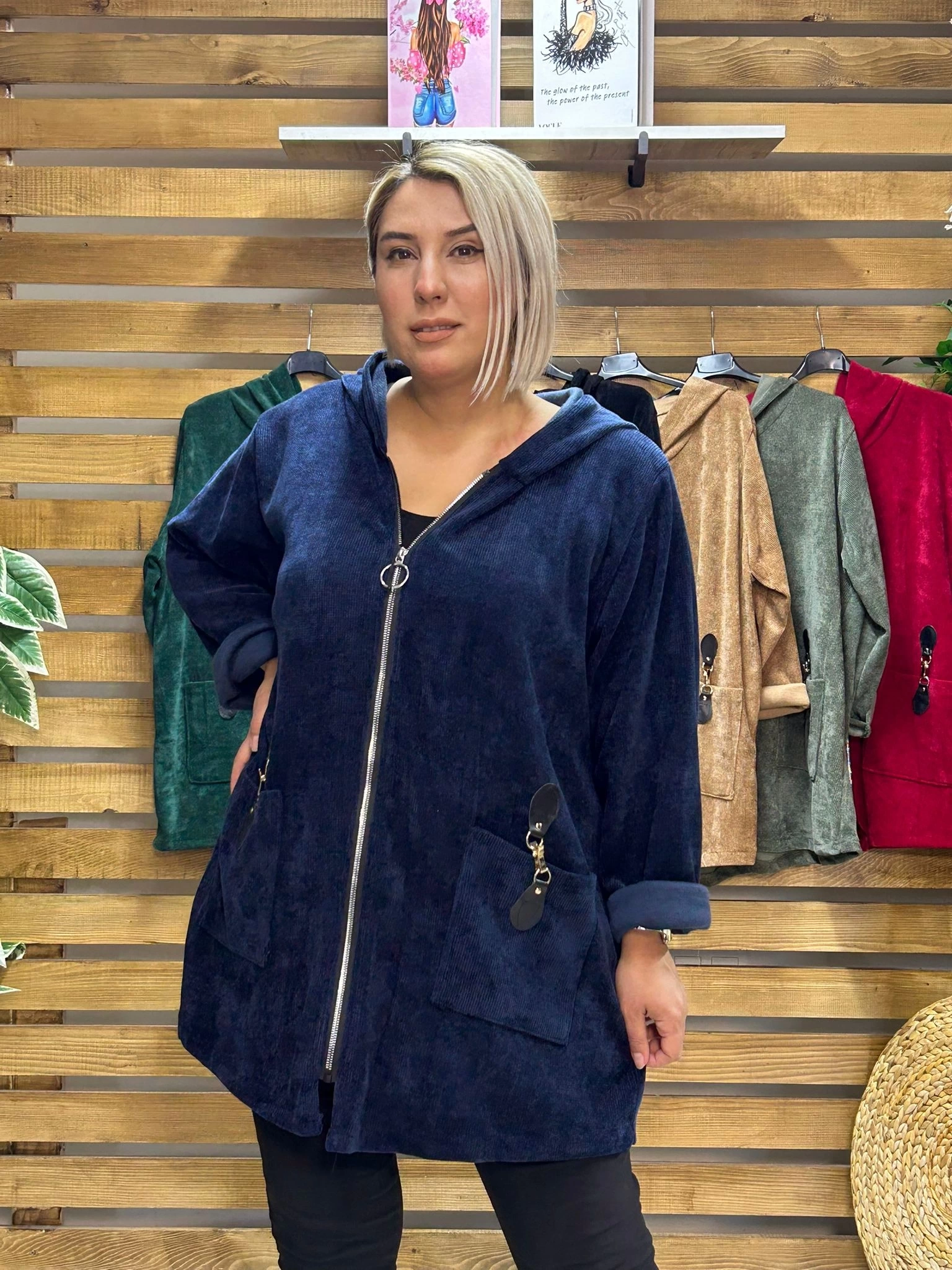 İtalyan Tasarım Kapüşonlu Oversize Kadife Ceket