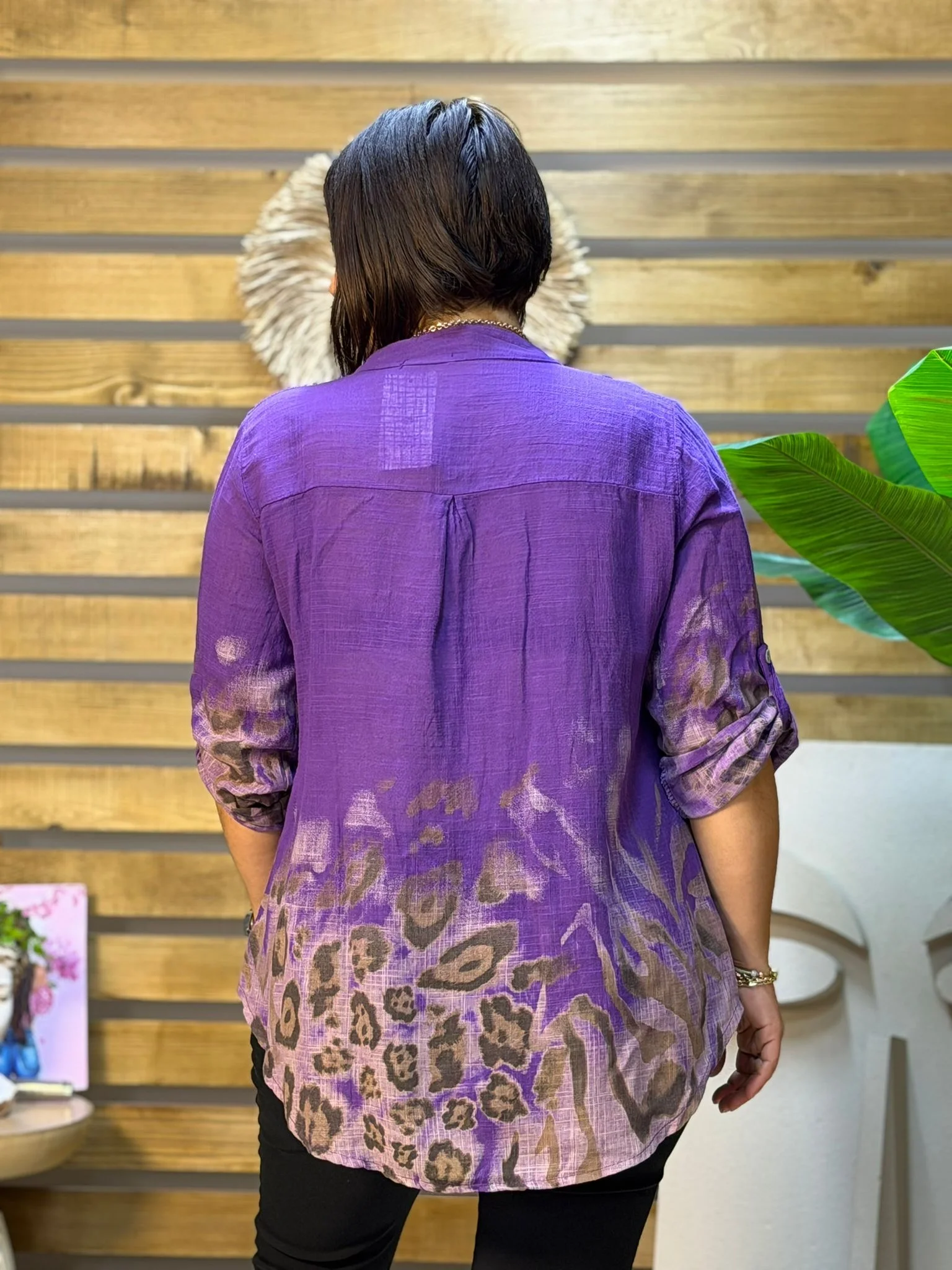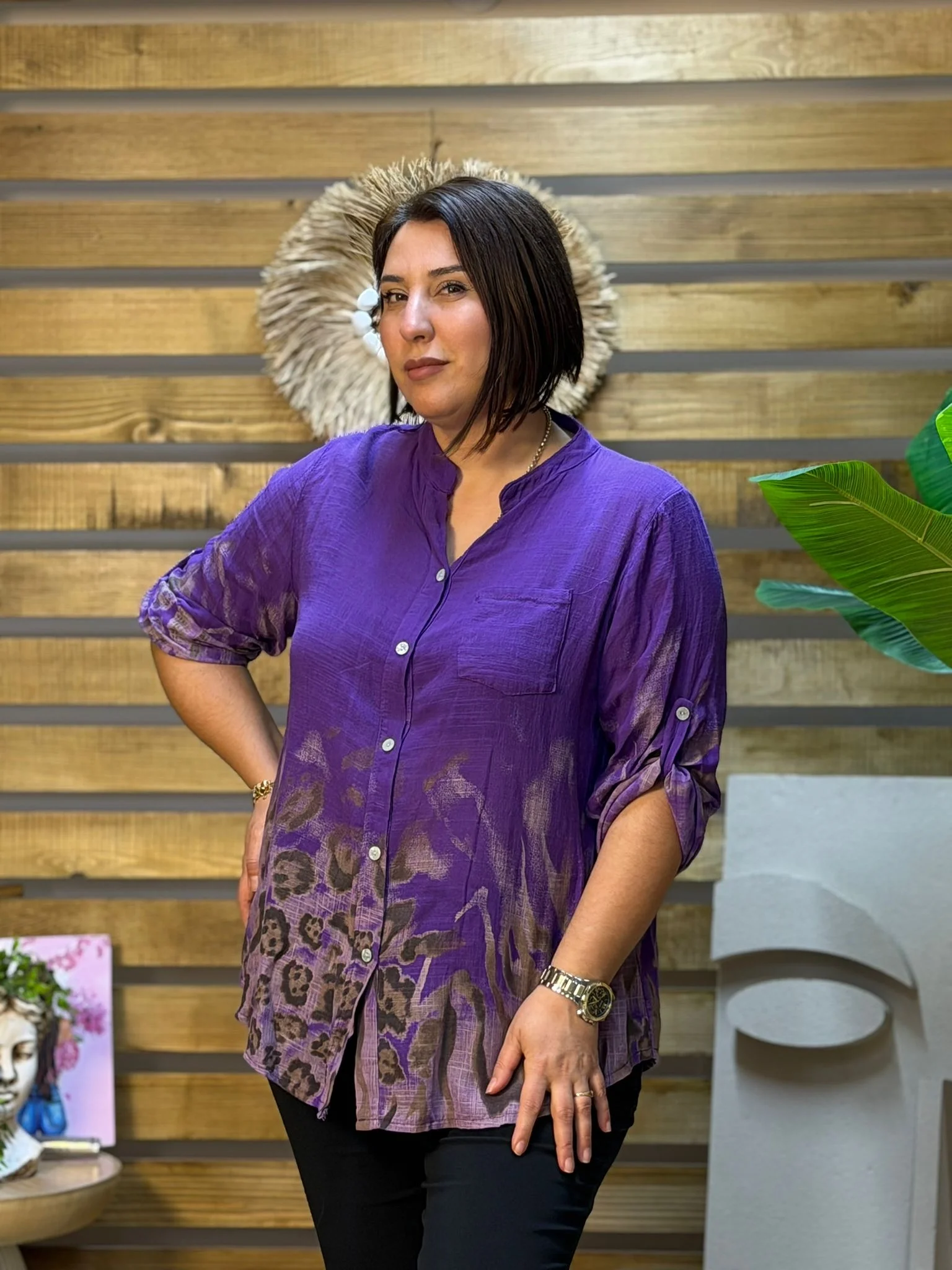 İtalyan Tasarım Keten Leopar Desen Gömlek Mor
