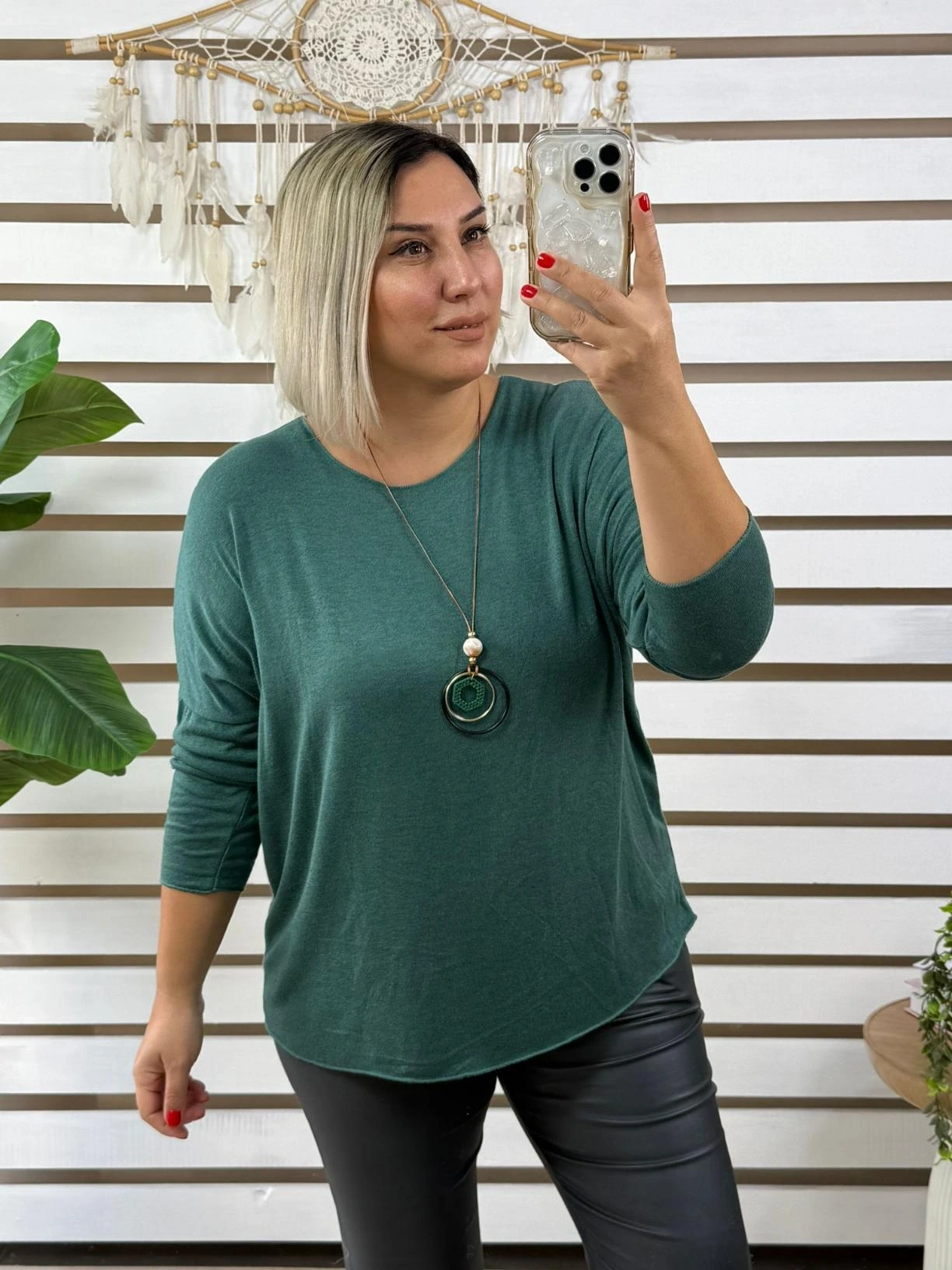 Yumuşacık dokusu ve İtalyan tasarım zarafetiyle öne çıkan bu yuvarlak yaka triko bluz, hem günlük hem şık kombinlerin vazgeçilmez parçası oluyor. Standart beden yapısı sayesinde 48 bedene kadar rahatlıkla kullanılabilir. Ürünle birlikte gelen şık kolye hediyesi, görünümü tamamlayarak ekstra bir stil detayı sunar.