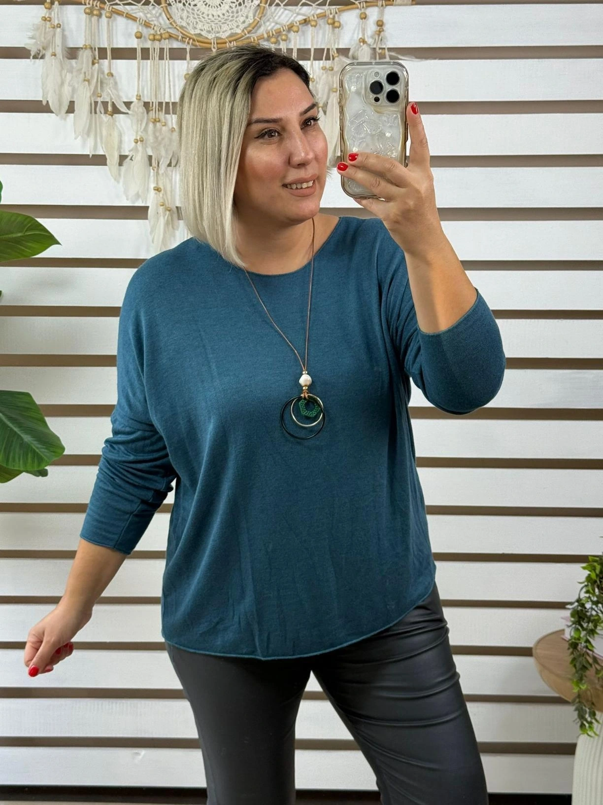 İtalyan Tasarım Kolyeli Yuvarlak Yaka Yumuşak Triko Bluz Türk Mavisi