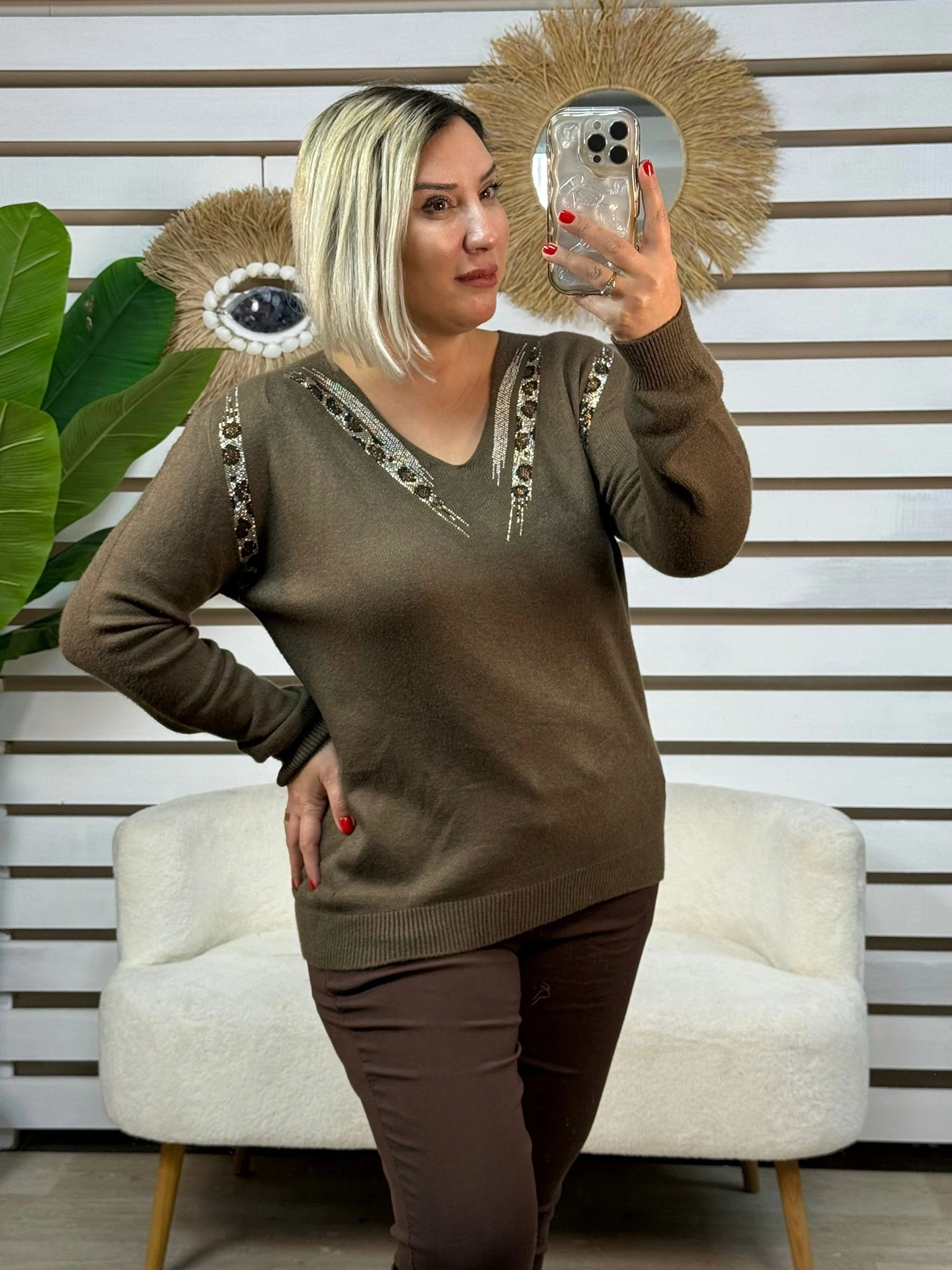 Cesur ve sofistike bir görünüm sunan bu triko bluz, leopar desenin enerjisini taşlı detayların ışıltısıyla buluşturur. İtalyan tasarım çizgilerinden ilham alan modeli, iddialı olduğu kadar zarif bir duruş sergiler.