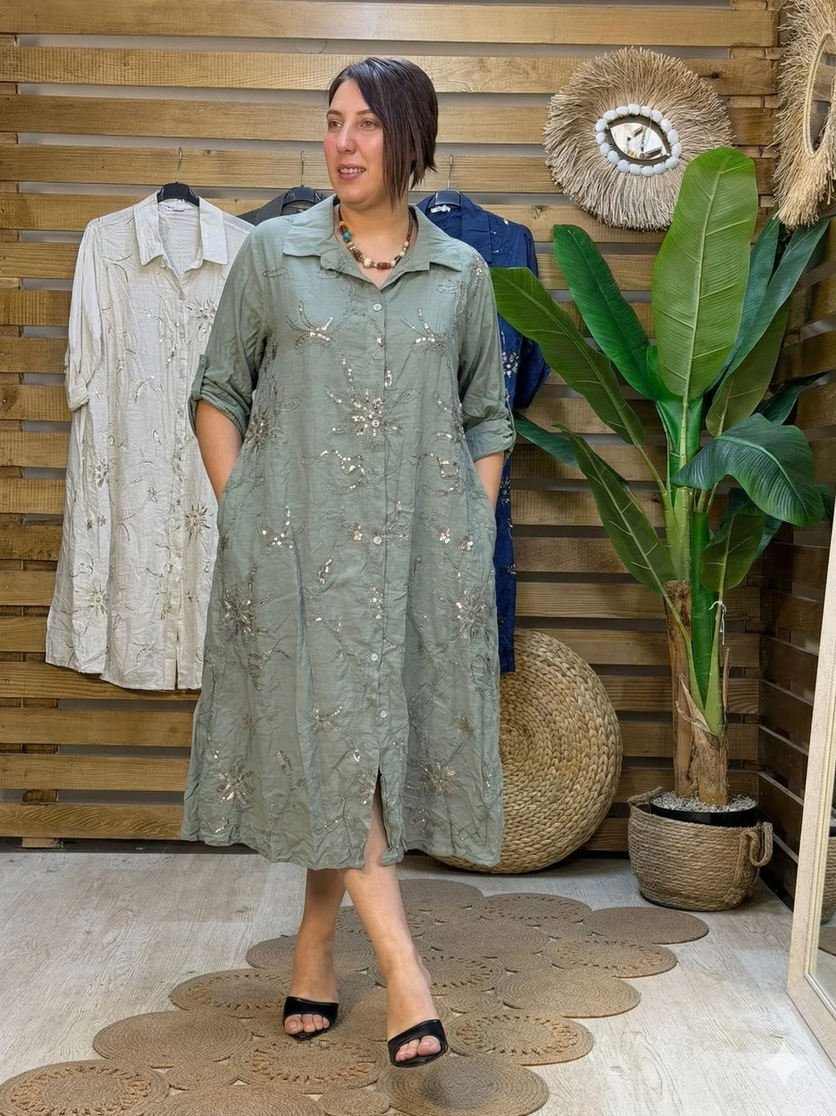 Gömlek elbisenin klasik ve rahat duruşu, usta işi nakışlar ve göz alıcı pul detaylarıyla yeniden yorumlandı! Paprica Butik'in kalite anlayışını yansıtan bu İtalyan tasarım elbise, hem günlük şıklığınızda hem de özel davetlerde tek parçayla yıldızlaşmanızı sağlıyor.