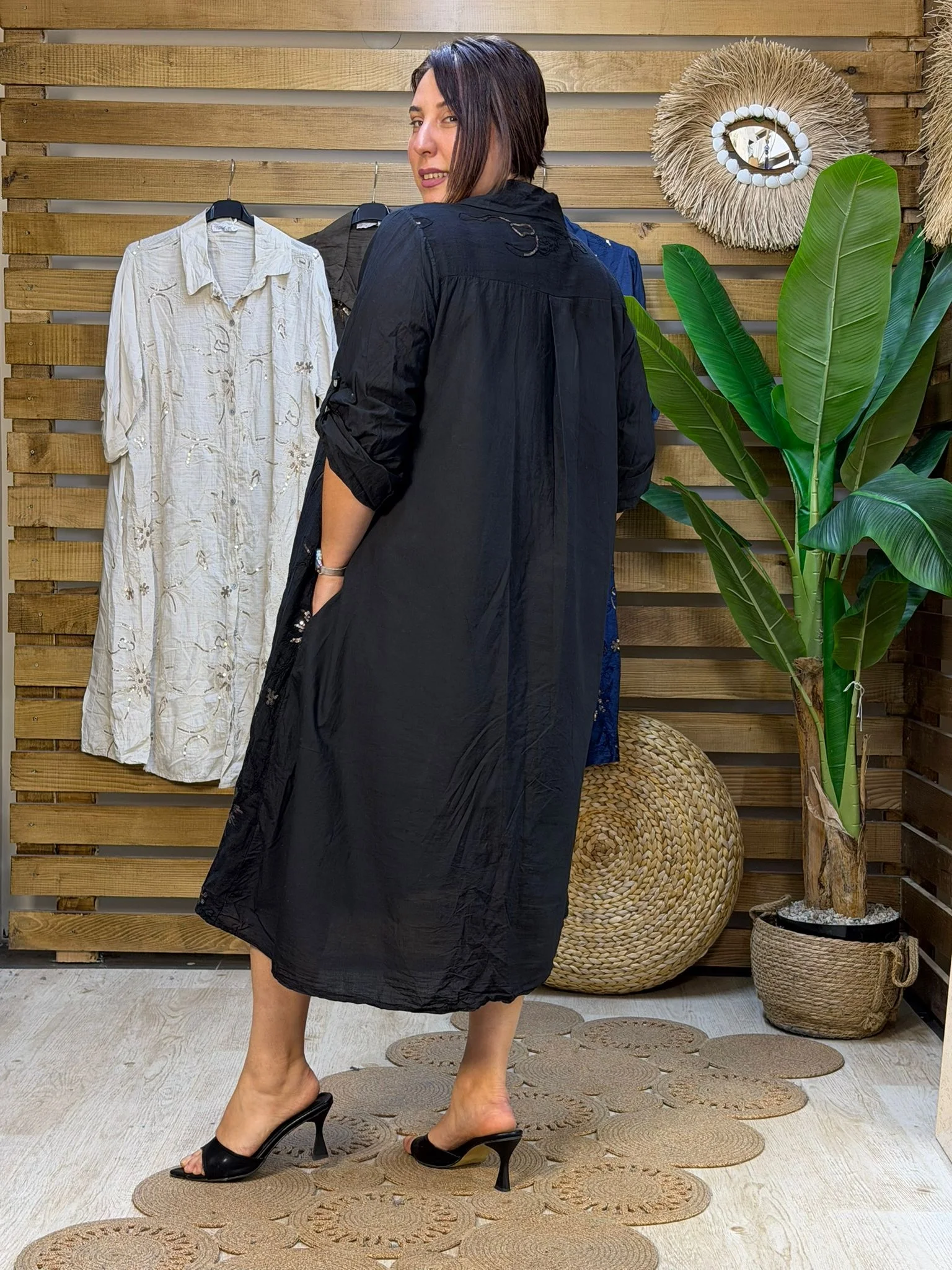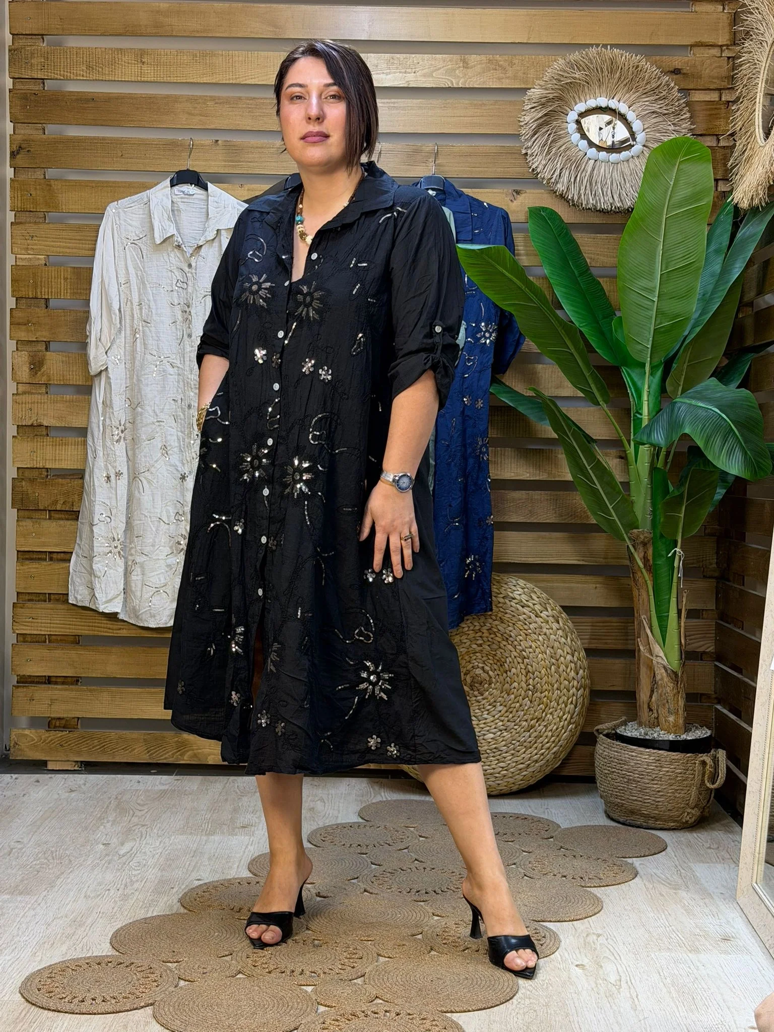 Gömlek elbisenin klasik ve rahat duruşu, usta işi nakışlar ve göz alıcı pul detaylarıyla yeniden yorumlandı! Paprica Butik'in kalite anlayışını yansıtan bu İtalyan tasarım elbise, hem günlük şıklığınızda hem de özel davetlerde tek parçayla yıldızlaşmanızı sağlıyor.