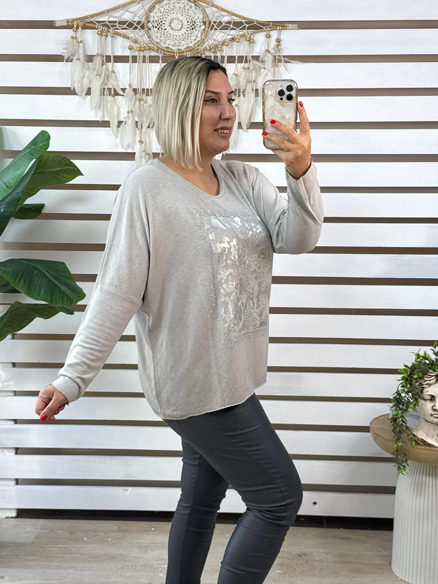 İster kumaş pantolonla ofis stilinizi tamamlayın, ister kotlarla modern bir şehir kombini oluşturun — bu bluz her ortamda zarif bir ışıltı sunar.