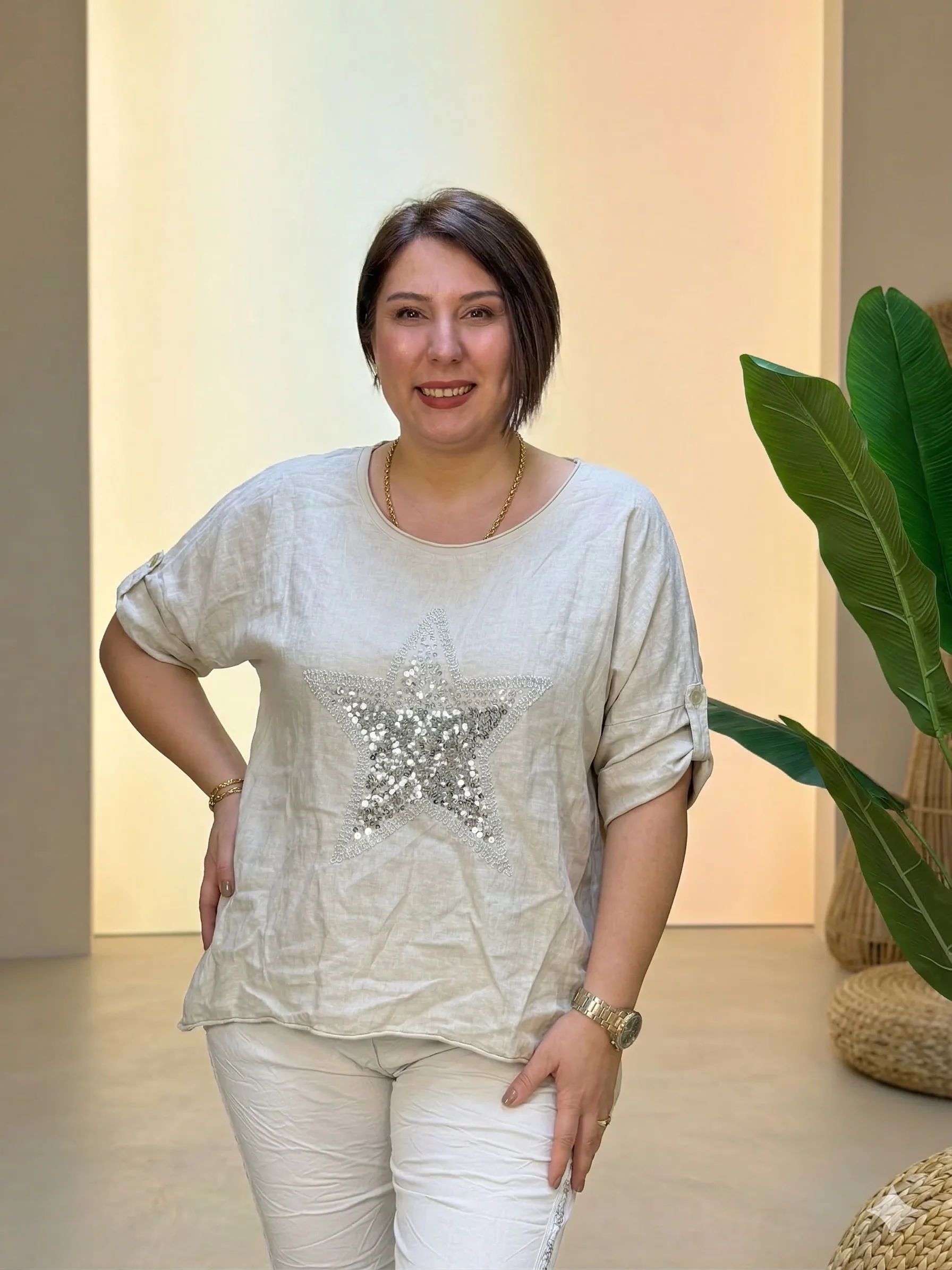 İtalyan Tasarım Önü Yıldız Kabartma Detaylı Bluz Keten