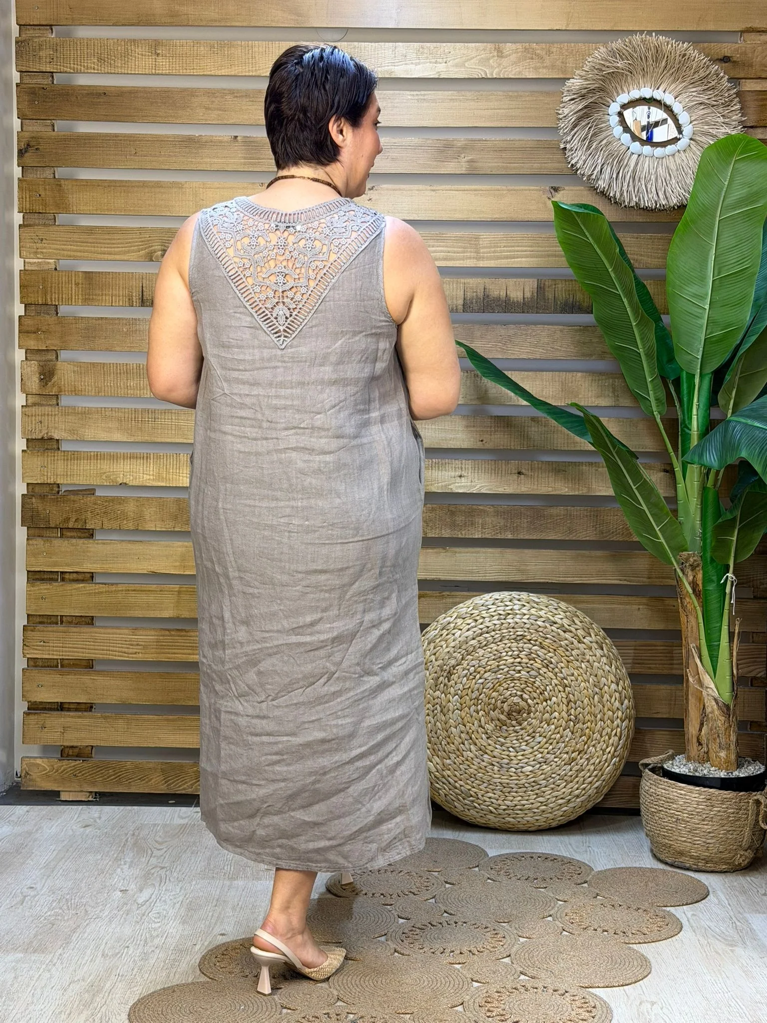 İtalyan Tasarım Sırt İşleme Detaylı Keten Elbise Vizon