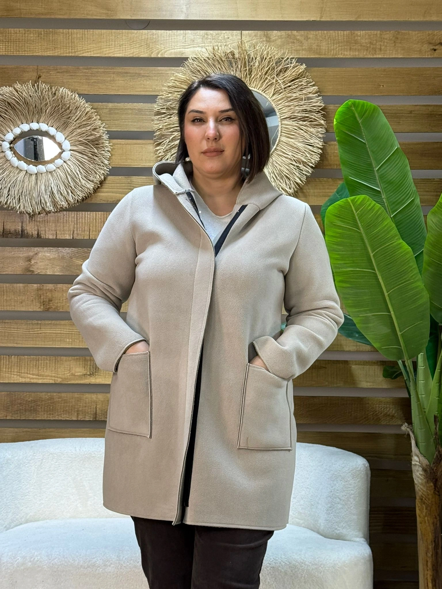 İtalyan Tasarım Suet Nubuk Uzun Kapüşonlu Ceket Krem