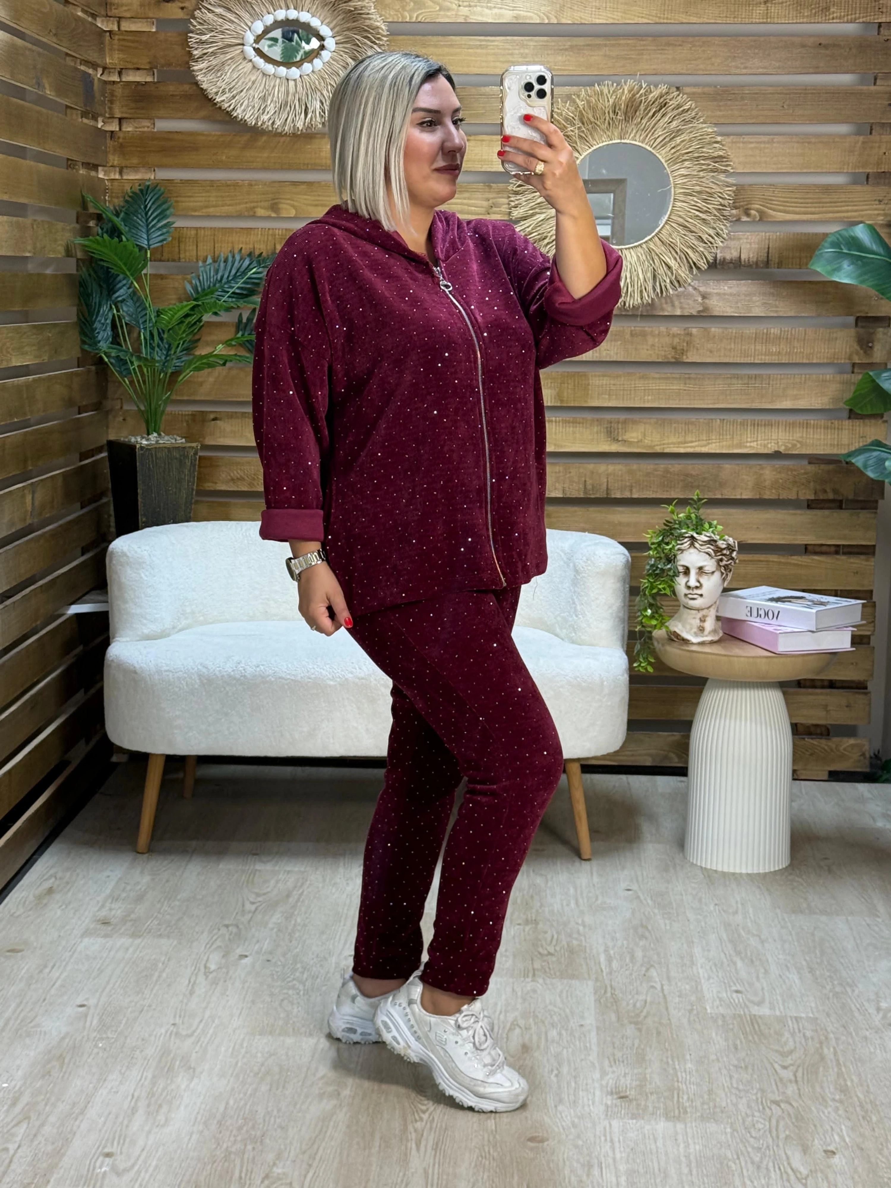 İtalyan Tasarım Taş İşlemeli Fermuarlı Kapüşonlu Kadife Takım Bordo