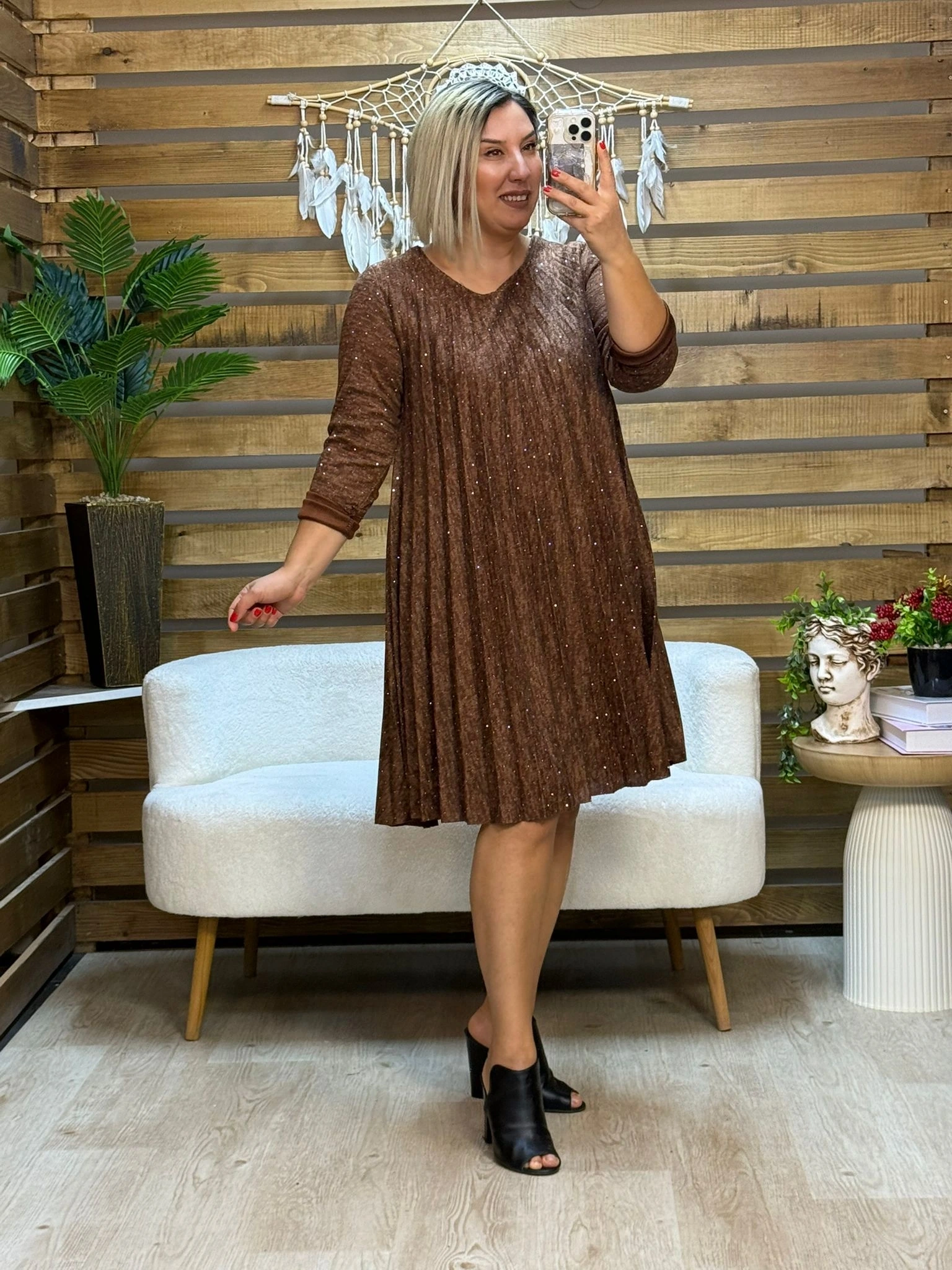 İtalyan Tasarım Taş İşlemeli Pliseli Elbise, dökümlü pliseli kumaşıyla her hareketinizde zarafet kazandırırken, taş işlemeleriyle ışıltılı bir görünüm sunar.