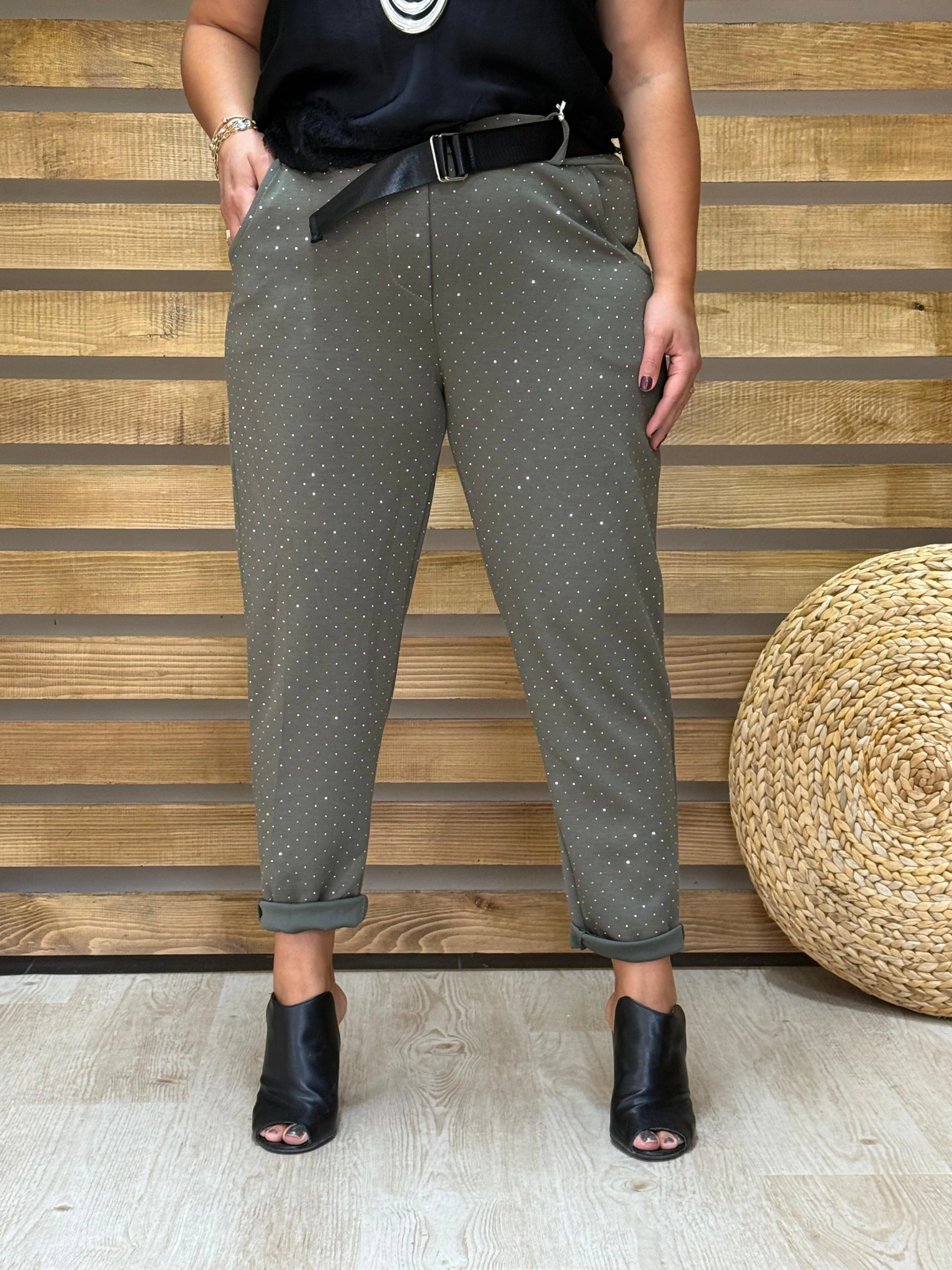 Şıklığı ve rahatlığı bir arada sunan bu özel tasarım pantolon, zarif taş detayları ile göz alıcı bir stil yaratır. Haki rengin sofistike duruşu sayesinde hem günlük hayatta hem de özel kombinlerde kolayca kullanılabilir.