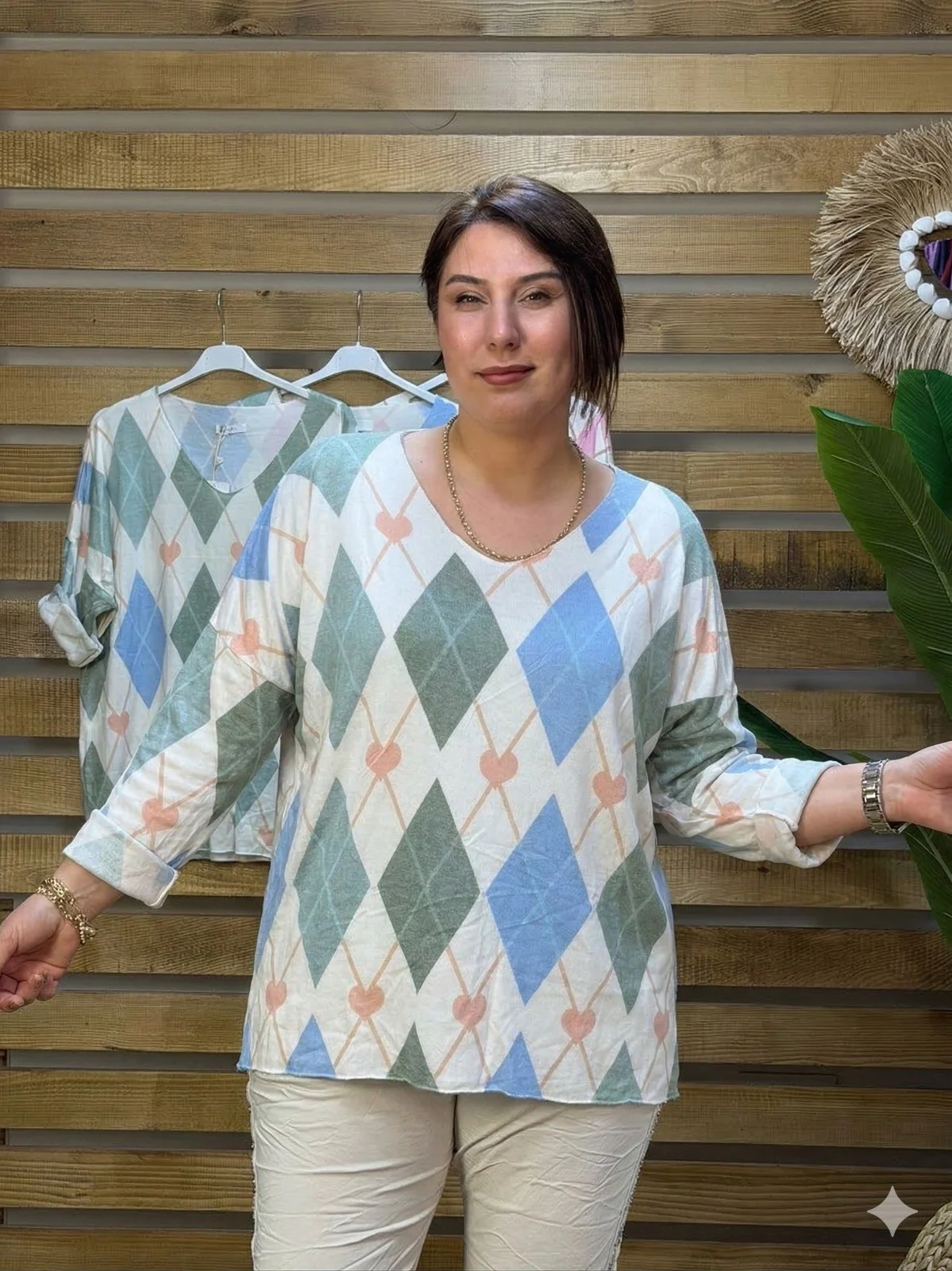 • İthal İtalyan tasarımı, dijital baskılı, V yaka angora karışımlı pembe bluz. 48 bedene kadar uyumlu standart kalıbı ve hafif dokusuyla yüksek kalite sunar.