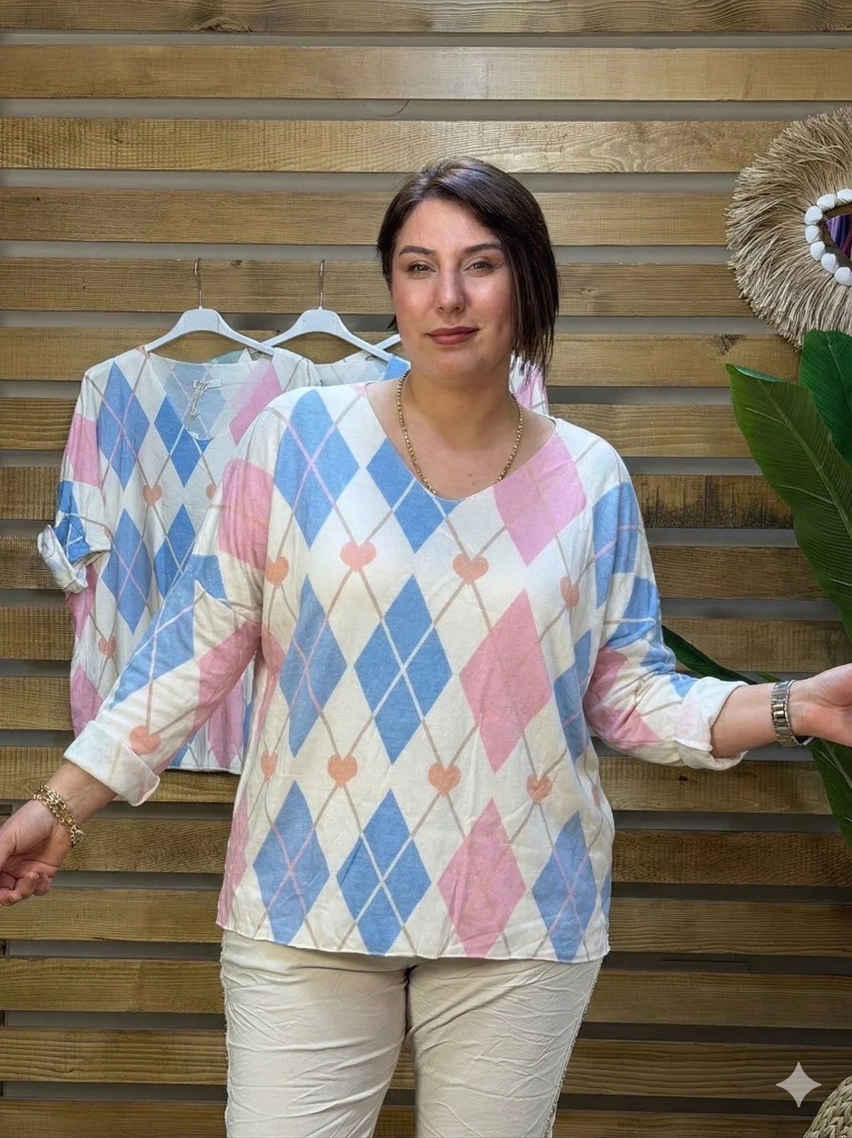 • İthal İtalyan tasarımı, dijital baskılı, V yaka angora karışımlı pembe bluz. 48 bedene kadar uyumlu standart kalıbı ve hafif dokusuyla yüksek kalite sunar.