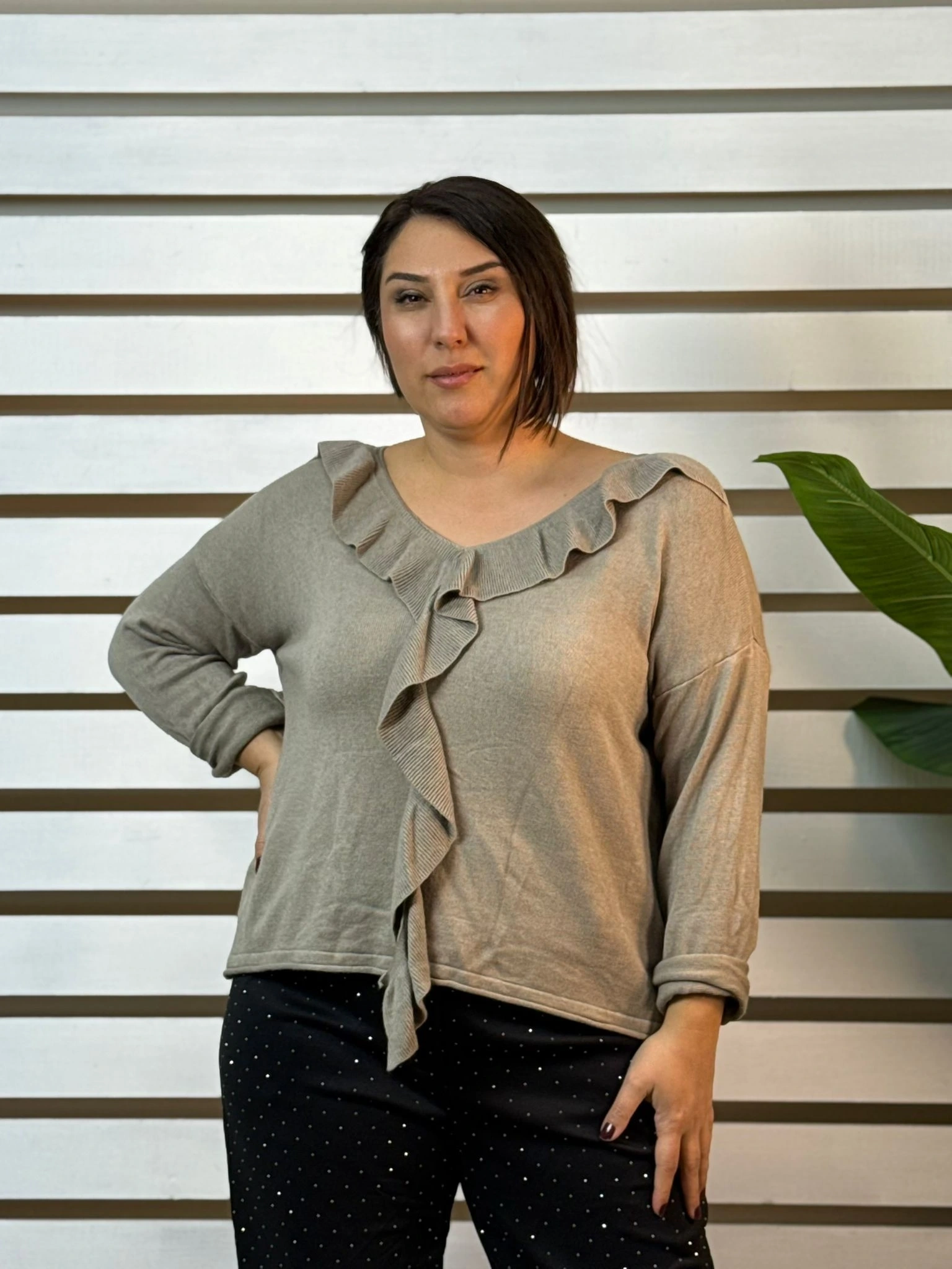 İtalyan Tasarım V Yaka Volan Detaylı Angora Kazak Vizon