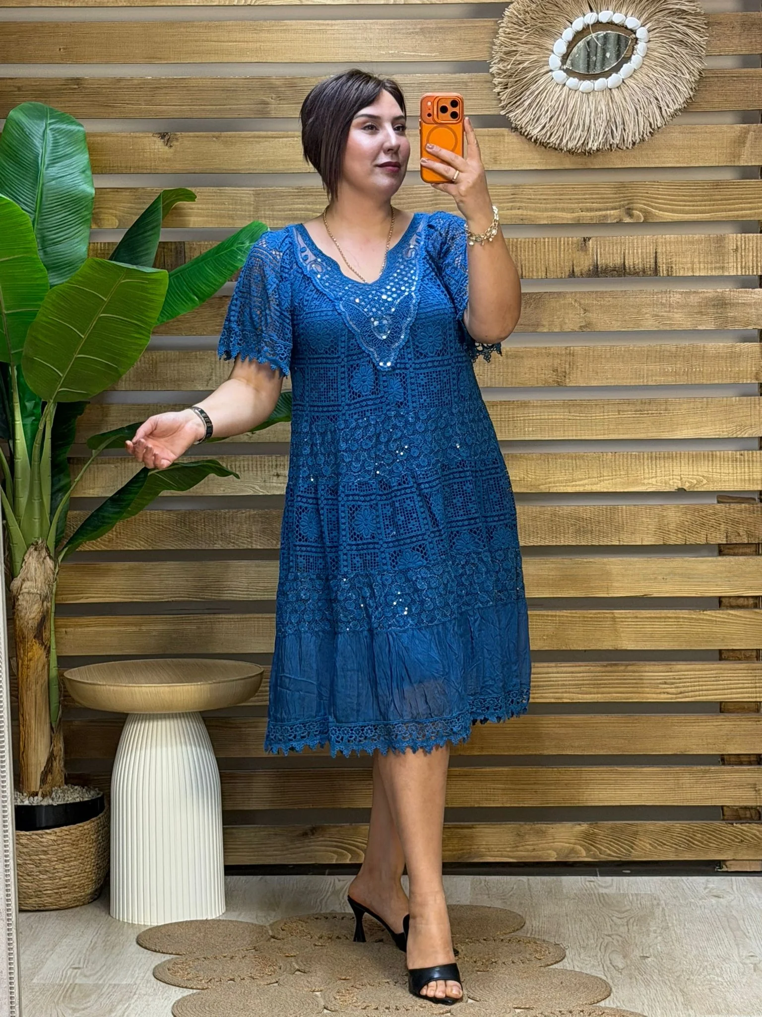 • İthal İtalyan tasarımı, yakası pul detaylı yüksek kalite ipek elbise. 48 bedene kadar uyumlu standart kalıbı ve dökümlü yapısıyla lüks bir şıklık sunar.
