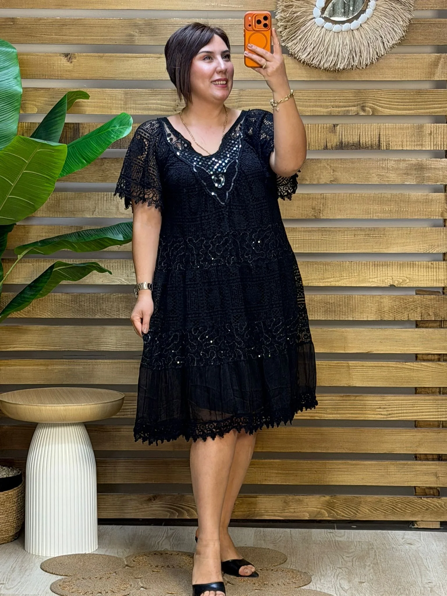 • İthal İtalyan tasarımı, yakası pul detaylı yüksek kalite ipek elbise. 48 bedene kadar uyumlu standart kalıbı ve dökümlü yapısıyla lüks bir şıklık sunar.