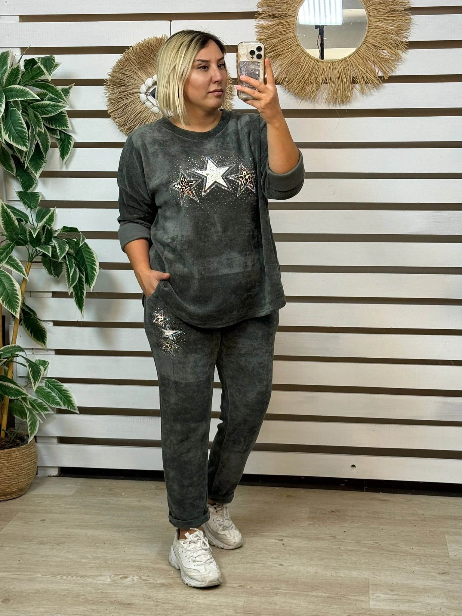 İtalyan Tasarım Yıldız Detaylı Taş İşlemeli Kadife Takım Haki