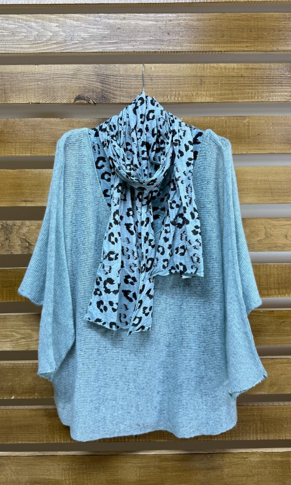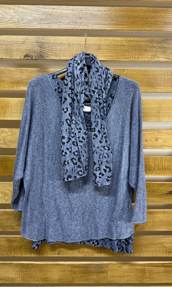 İtalyan Tasarım Leopar Desen Fularlı Yün Bluz İndigo