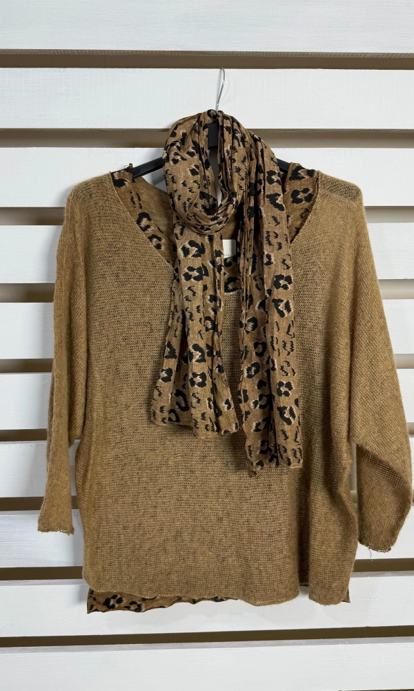 İtalyan Tasarım Leopar Desen Fularlı Yün Bluz Camel