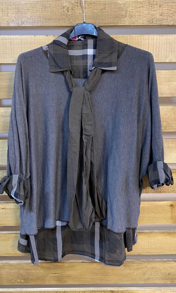 İtalyan Tasarım Ekose Desen Gömlekli Pamuklu Bluz Acı Kahve