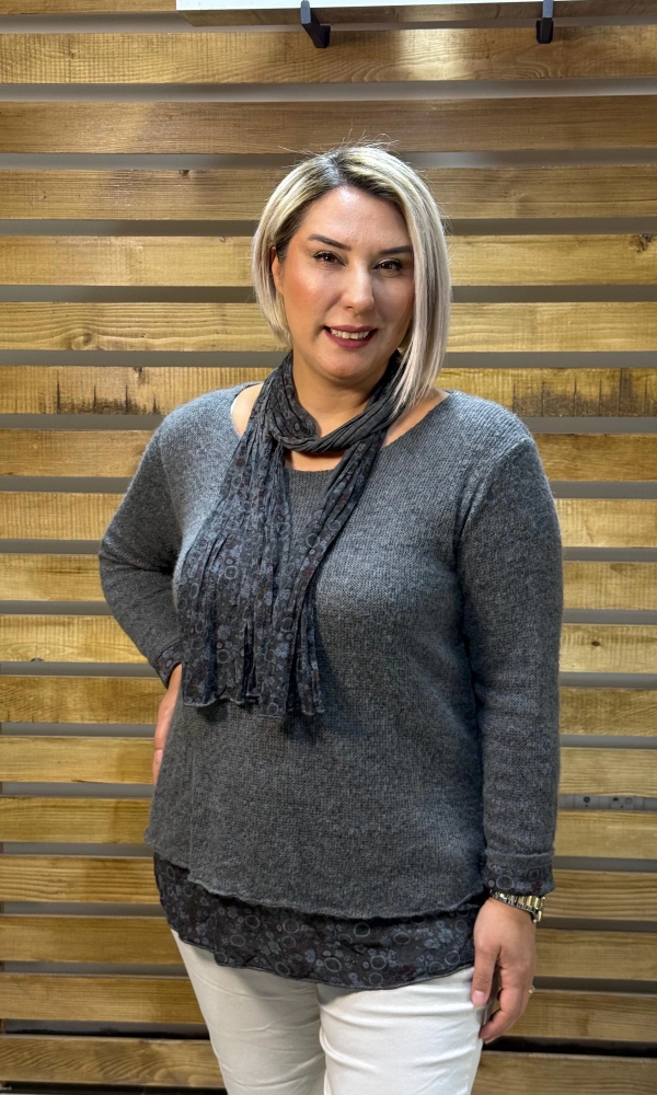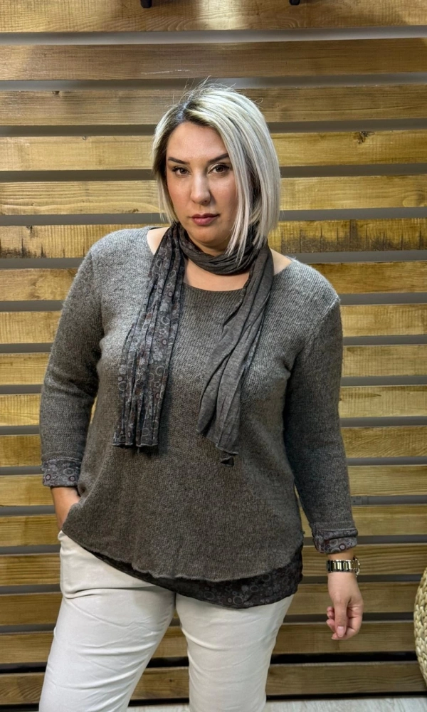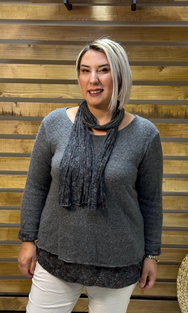 İtalyan Tasarım Yuvarlak Yaka Hamur Triko Bluz Gri