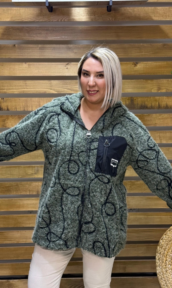 İtalyan Tasarım Rafya Desen Fermuarlı Yün Keçe Ceket Haki