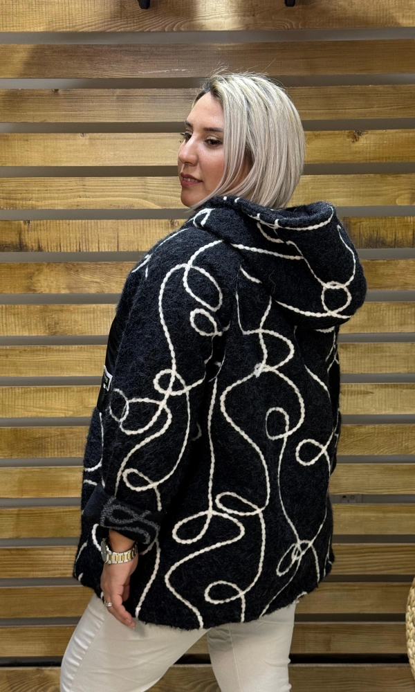 İtalyan Tasarım Sarmaşık Çiçek Kabartmalı Kapitone Kapüşonlu Ceket Siyah