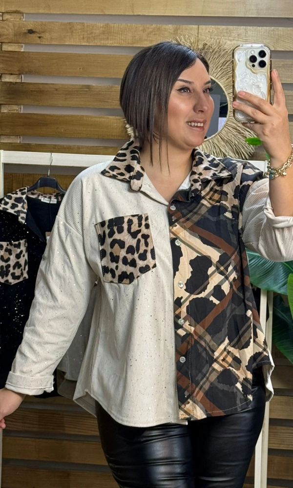İtalyan Tasarım Leopar Desen Kadife Gömlek Beyaz