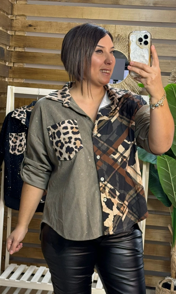 İtalyan Tasarım Leopar Desen Kadife Gömlek Haki