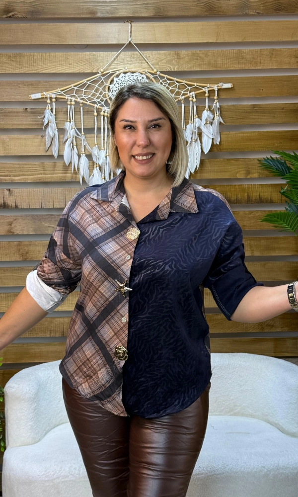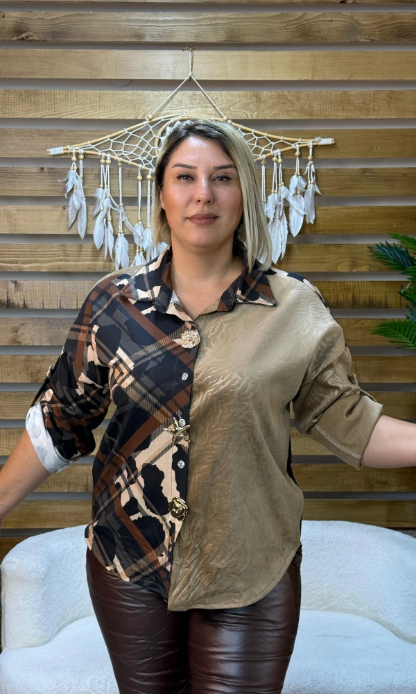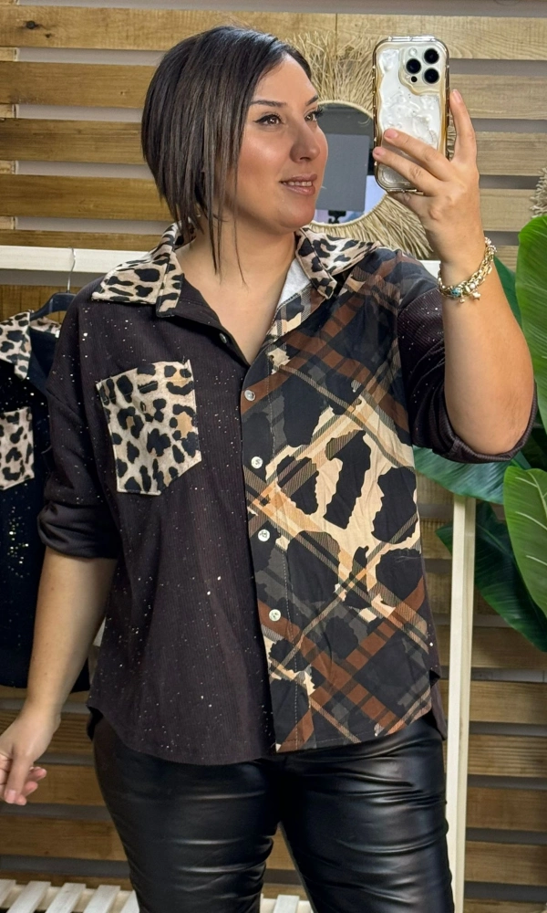İtalyan Tasarım Leopar Desen Kadife Gömlek Acı Kahve