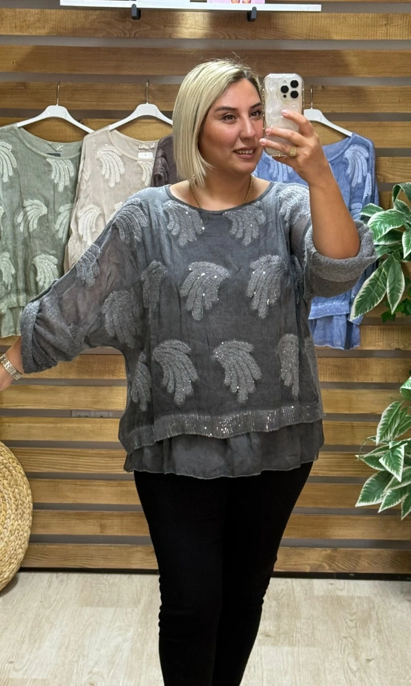 İtalyan Tasarım Önü İpek Arkası Triko V Yaka Bluz Antrasit