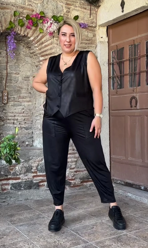 Deri Görünümlü Bluz,yelek,kolye ve Pantolon Takım